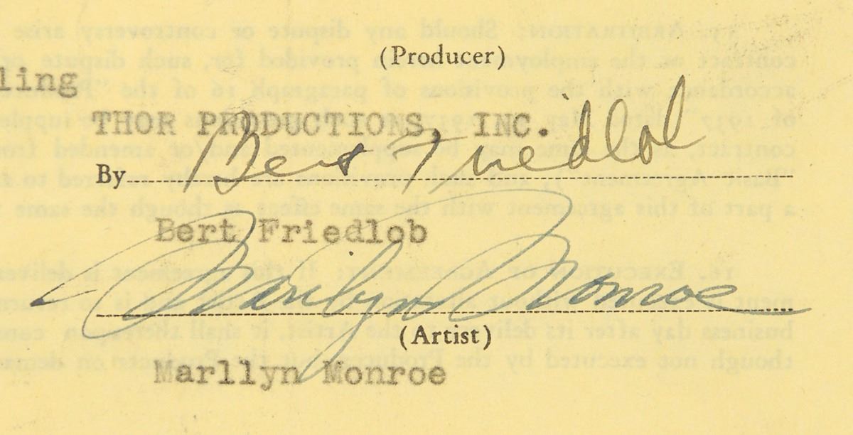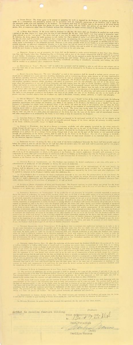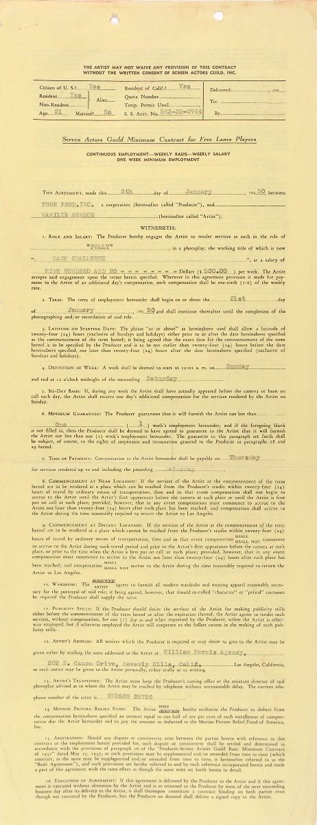 DS, one page both sides, 8.5 x 21.5, January 5, 1950. Screen Actors Guild freelance contract between Monroe and Thor Productions for her to “render services as such in the role of ‘Polly,’ in a photoplay, the working title of which is now ‘Dark Challenge,’ at a salary of…$500.” Signed at the conclusion in fountain pen by Monroe and countersigned by the producer, Bert Friedlob. In fine condition, with expected document wear and various stray marks (none affecting the clean, bold signature). Described here under its working title, Dark Challenge, the film was ultimately released as The Fireball, starring Mickey Rooney and Pat O'Brien in the story of orphans who run away to join a roller skating team. Monroe had just a bit part as a love interest, appearing in six brief scenes. Soon after The Fireball's release, Monroe's career began to gain momentum and she began booking roles in more serious films. That same year she auditioned for John Huston who cast her in Asphalt Jungle. Her performance brought strong reviews, as well as the the notice of Joseph Mankiewicz, who cast her in All About Eve.