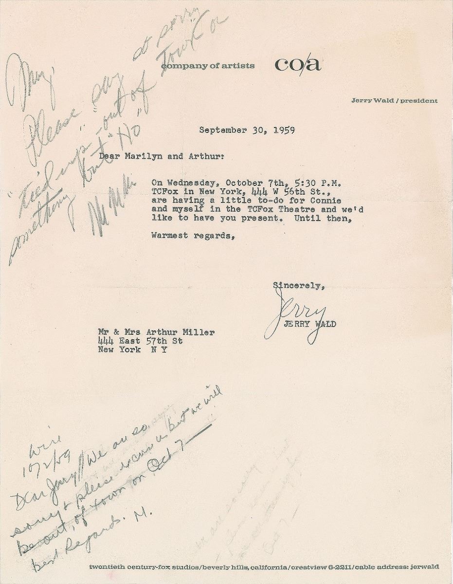Handwritten note in pencil in the upper left corner of a typed letter from screenwriter Jerry Wald inviting Monroe and Arthur Miller to an event at the “TCFox Theatre” on October 7th at 5:30 pm, one page, 8.5 x 11, Company of Artists letterhead, September 30, 1959. Monroe writes to May Reis, her New York secretary, in full: “May, Please say so sorry ‘tied up’—‘out of town’ or something but ‘No,’ MMM.” Reis adds her proposed response on behalf of Monroe in the lower left corner. In fine condition, with intersecting folds.