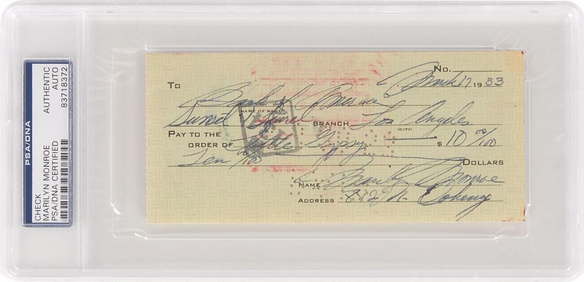 Bank check, 6 x 2.75, filled out and signed by Monroe, payable to Little Gypsy for $10, March 17, 1953. Encapsulated in a plastic PSA/DNA authentication holder. In very good to fine condition, with cancellation holes affecting a portion of her first name. A fantastic example of a Marilyn check featuring much of her handwriting.