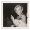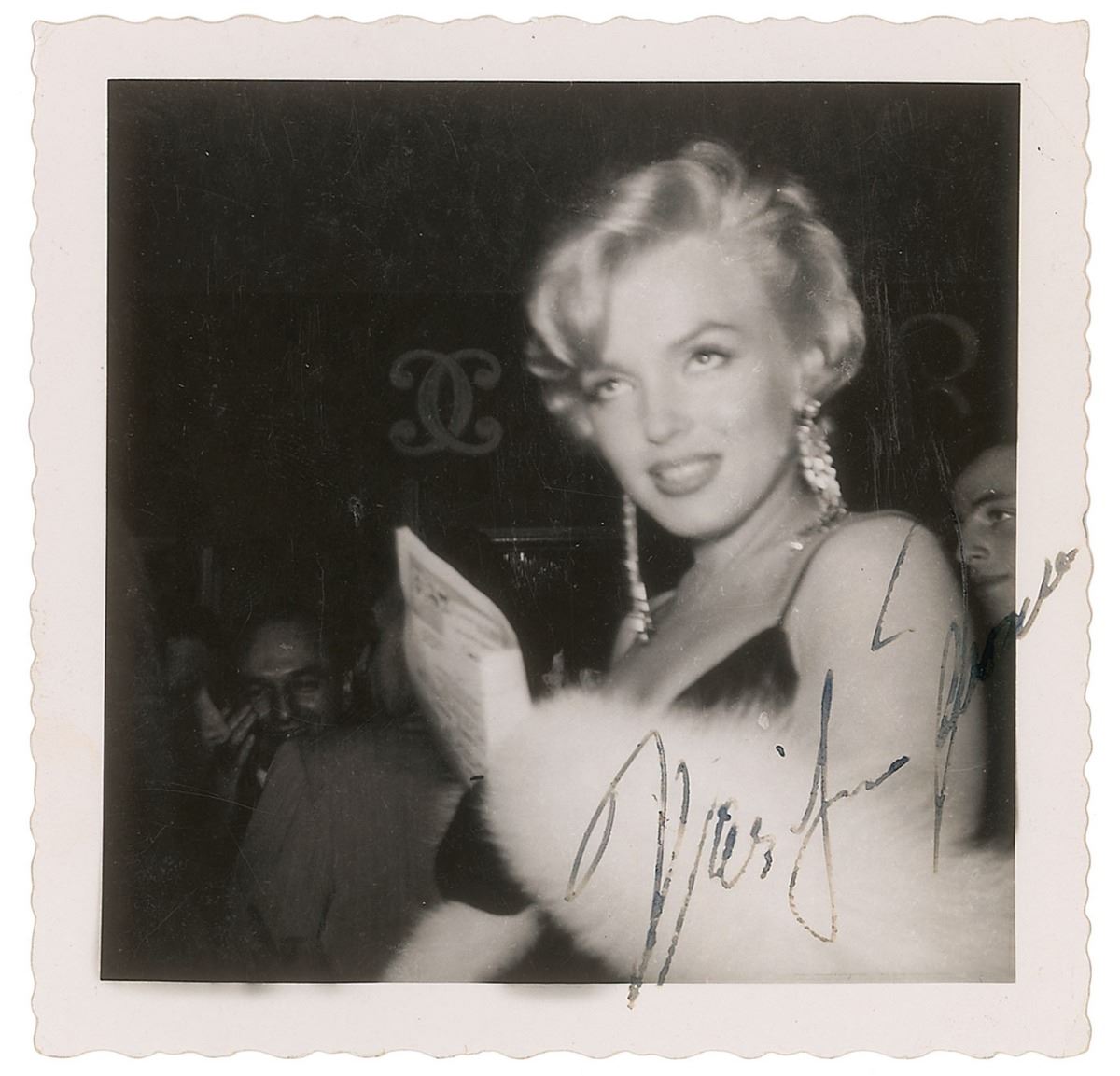 Vintage glossy 3.5 x 3.5 candid deckle-edge photo of Monroe with diamond earrings and a white fur stole, signed in fountain pen. Reverse of photo stamped, “224A.” In fine condition. A sensational, uninscribed photo of Monroe during a night on the town.