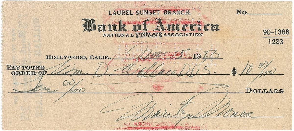 Bank of America check, 5.75 x 2.5, filled out and signed by Monroe, payable to William D. Wallace for $10, November 15, 1950. In fine condition, with usual bank cancellations. Less than a month before Monroe signed her career-making contract with 20th Century Fox.