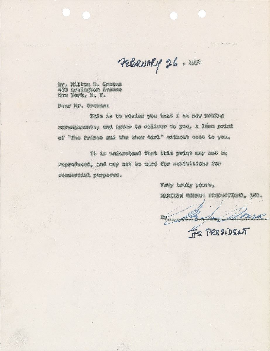 DS, one page, 8.5 x 11, February 26, 1958. An official letter to fashion photographer Milton H. Greene advising him “that I am now making arrangements, and agree to deliver to you, a 16mm print of ‘The Prince and the Showgirl’ without cost to you. It is understood that this print may not be reproduced, and may not be used for exhibitions for commercial purposes.” The document bears a “Marilyn Monroe Productions” blindstamp in the left margin. In fine condition.