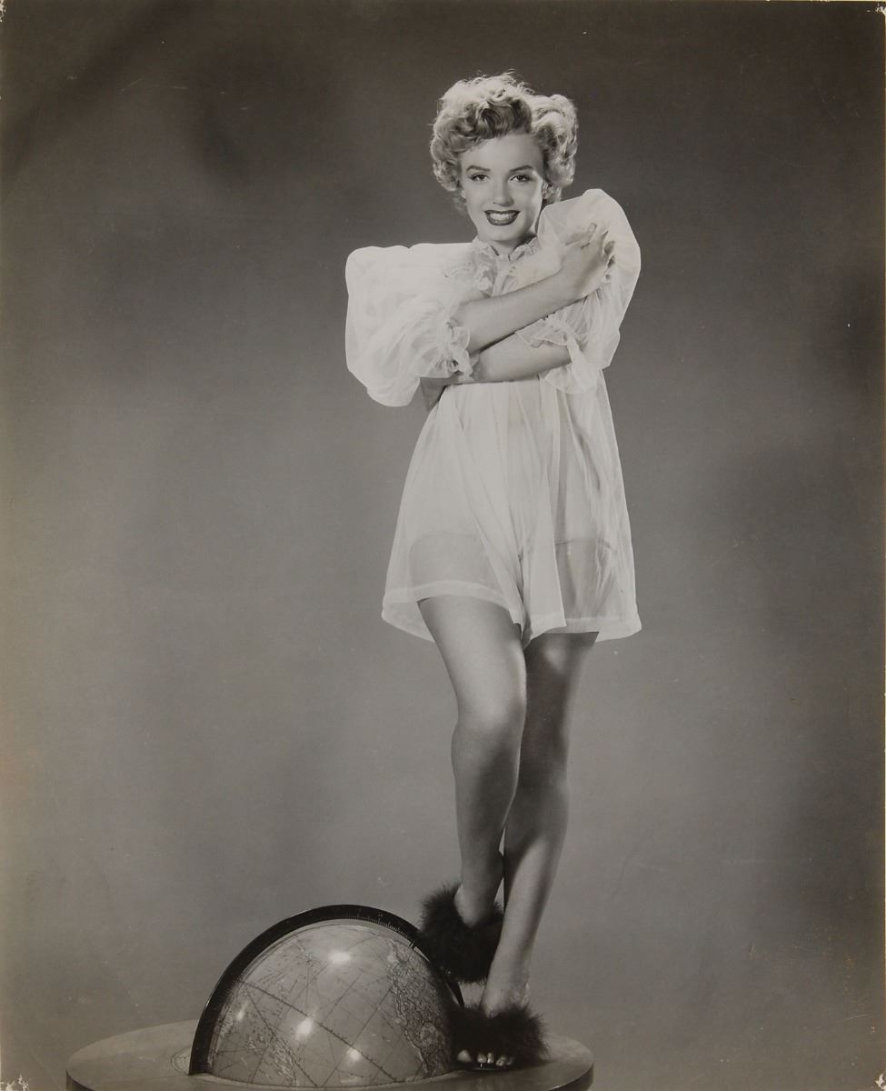 Fabulous vintage glossy 7.5 x 9.25 silver gelatin photo of Marilyn standing on a globe while wearing a sheer nightgown and furry slippers. In fine condition, with scattered creasing, tiny edge tears, and trimmed edges.