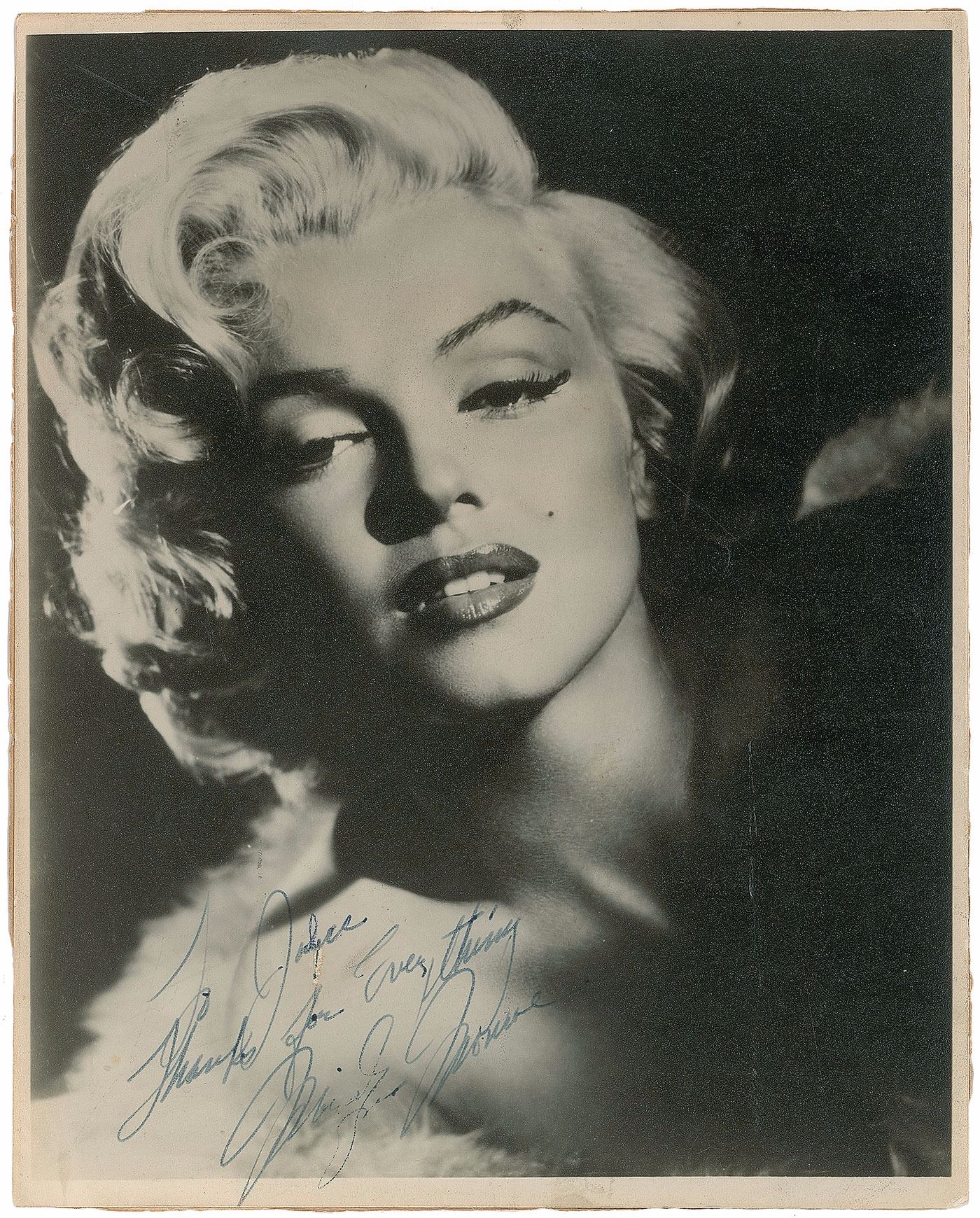 Sultry vintage Matte-finish 7.5 x 9.5 portrait of Monroe taken during a Frank Powolny glamour shoot in 1953, signed and inscribed in fountain pen, "To Joyce, Thanks for Everything, Marilyn Monroe.” In fine condition, with old mounting remnants over the entirety of the reverse, and the recipient's name in the inscription slightly altered by the addition of an upstroke in another hand (and the scratched-off removal of a downstroke). Monroe and Powolny most famously teamed up in 1953 for a series of stunning, artfully framed publicity stills for the 1953 film Gentlemen Prefer Blondes. Immortalized for his classic World War II pinup of Betty Grable, Powolny remained a trusted photographer for Monroe throughout her career, and is noted as taking the last known still photographs of the starlet during production of Something's Got to Give, one week before her death in 1962. An irresistible portrait of Monroe.