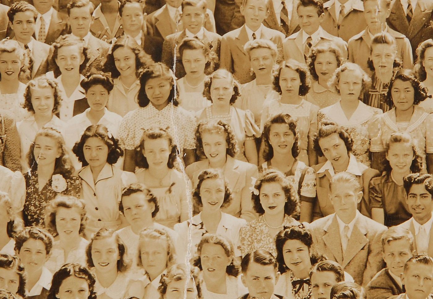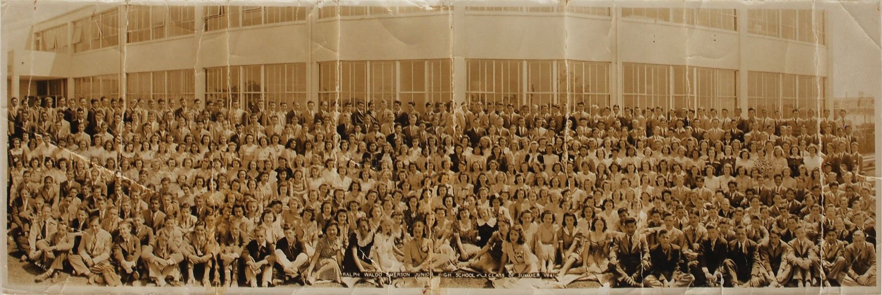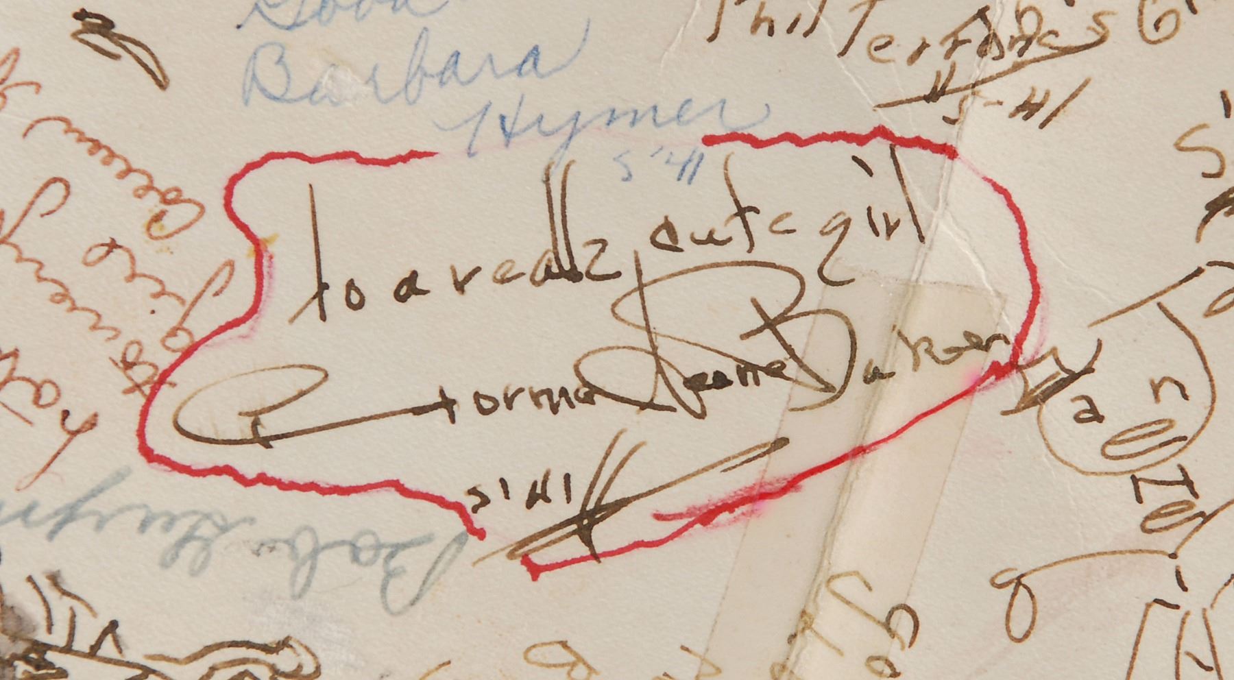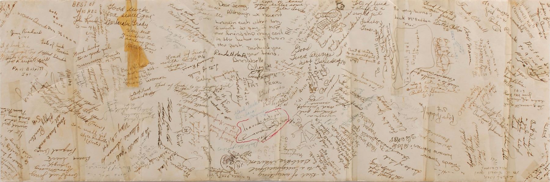 Incredibly scarce vintage 24 x 8 panoramic photo of the graduating Class of Summer 1941 Ralph Waldo Emerson Junior High School in Los Angeles, with a radiant Norma Jeane Baker (later Marilyn Monroe) identifiable to the right of center, signed on the reverse in black ink, "To a really cute girl, Norma Jeane Baker, 5' 41," with recipient adding a red ink circle around signature. In very good condition, with heavy vertical creases and edge tears all repaired with old tape on the signed side; the tape covers most of Monroe's last name, but doesn't affect readability whatsoever. While unsigned versions of this photo appear from time-to-time, signed examples are extremely uncommon, and represent one of the earliest examples of the future starlet's signature.