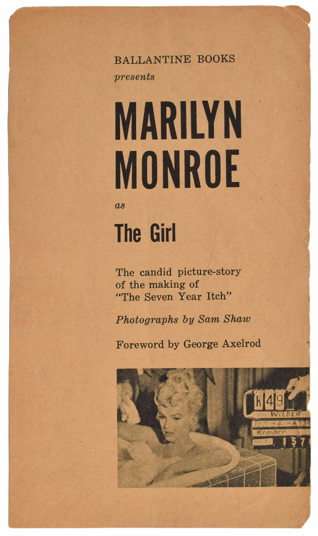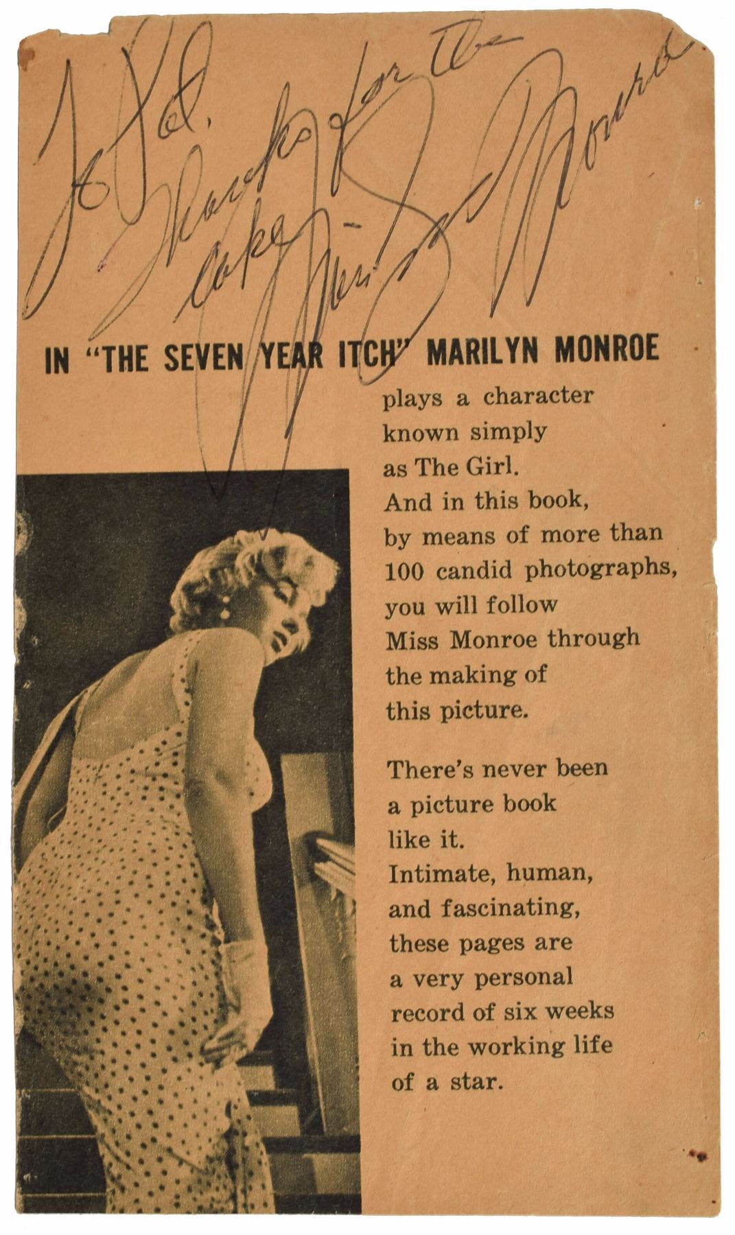 Page from the 1955 book entitled "Ballantine Books presents Marilyn Monroe as The Girl; the candid picture-story of the making of 'The Seven Year Itch,'" 4 x 6.75, signed and inscribed in black ballpoint. "To Pat, Thanks for the cake, Marilyn Monroe." In very good to fine condition, with trimmed edges and tiny chips to upper corners. Accompanied by two other detached pages from the book. An unusual format related to one of Monroe's most famous films.