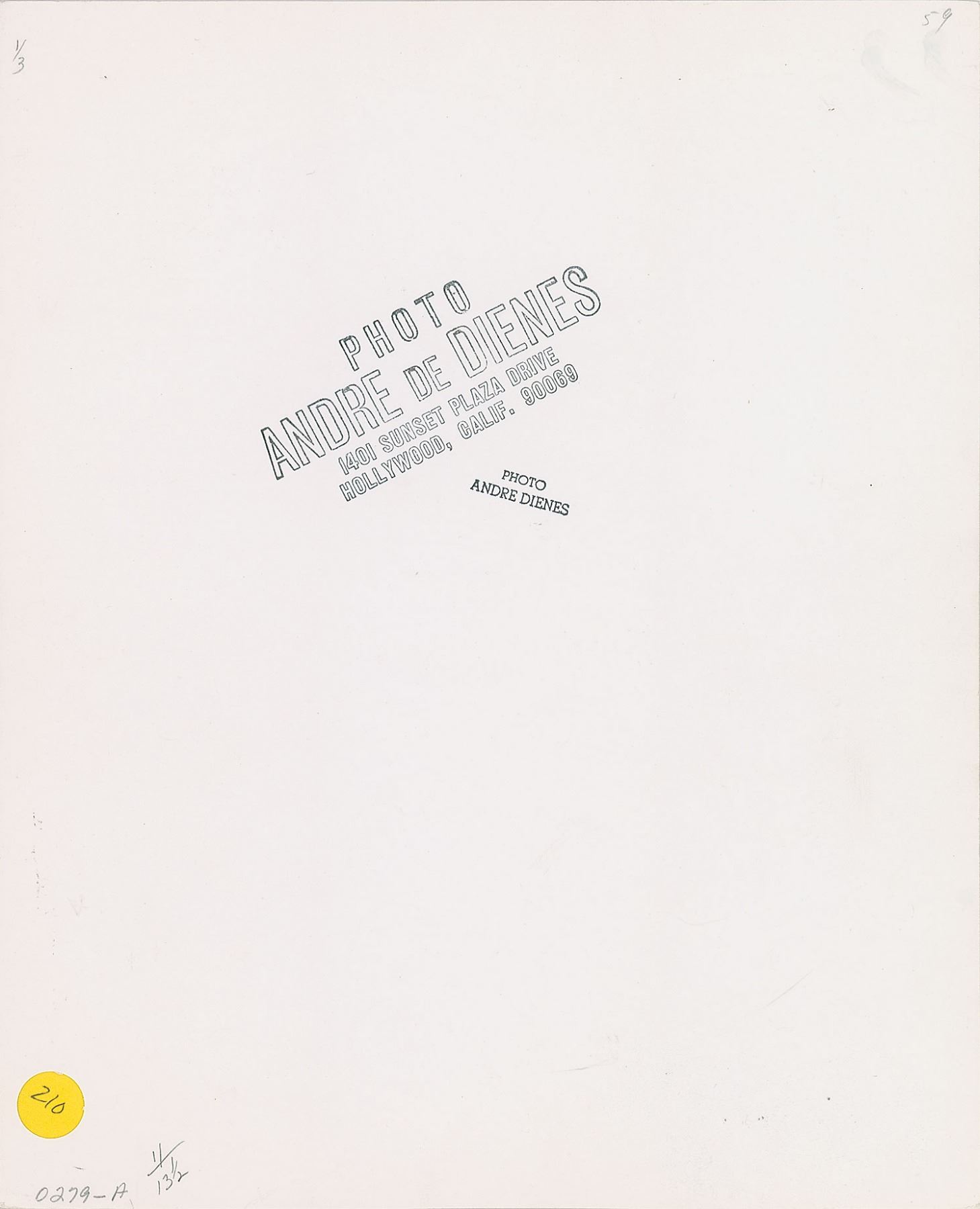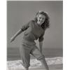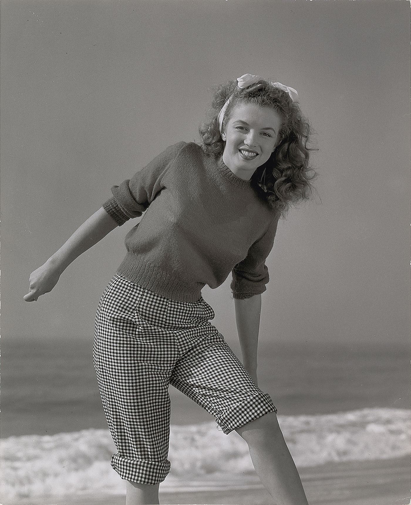 Original vintage glossy 11 x 13.5 silver gelatin photo of Norma Jeane wearing a sweater and rolled-up checkered pants, taken by Andre de Dienes at Malibu Beach in 1945. Reverse bears Andre de Dienes copyright stamps. In fine condition.