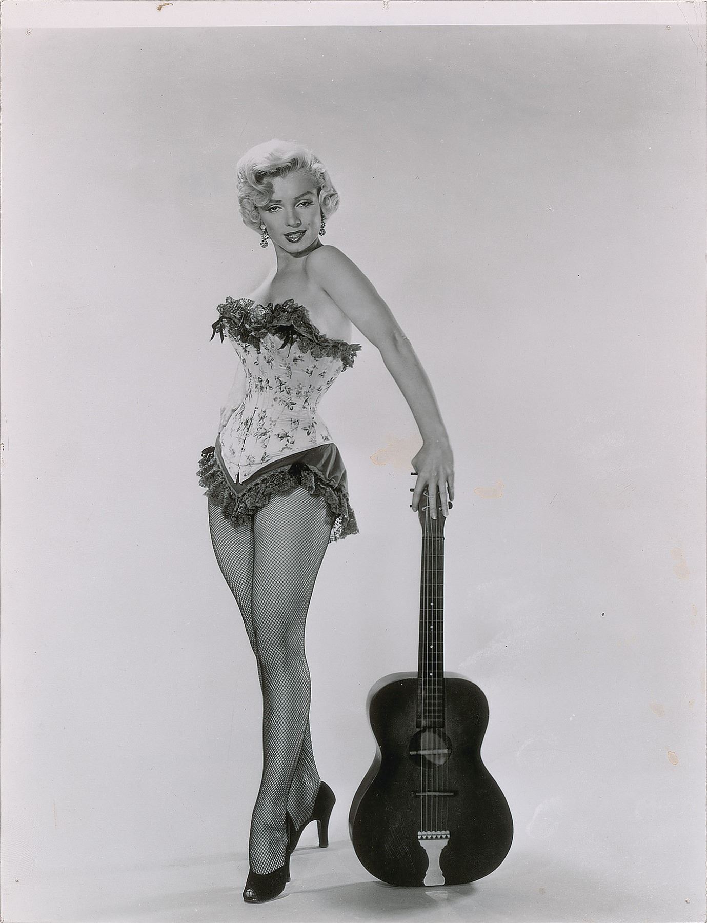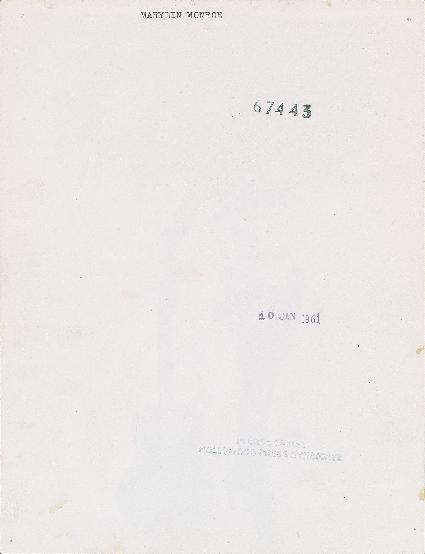 Original vintage glossy 7.25 x 9.5 photo of Monroe in a seductive pose with an acoustic guitar, bearing a "Hollywood Press Syndicate" credit stamp on the reverse and a date of January 10, 1961. In fine condition, with trimmed borders and pin holes to each corner.