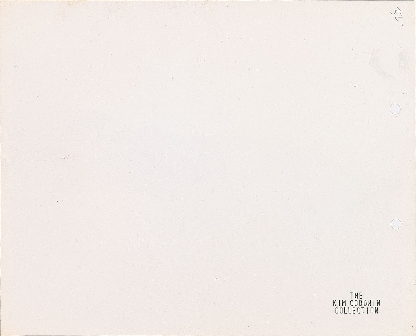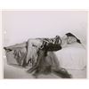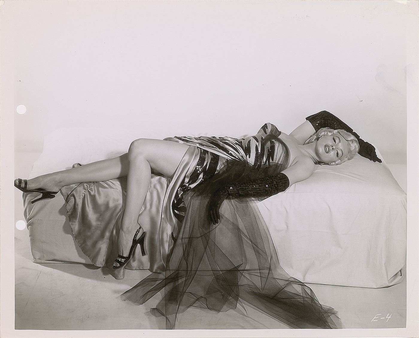 Original vintage glossy 10 x 8 silver gelatin photo of Monroe in an elaborate gown reclining on a wedge-shaped couch, bearing a "Kim Goodwin Collection" typed notation on the reverse. In fine condition, with a trimmed bottom edge, punch holes to left side, and scattered light creasing, primarily to the corners.