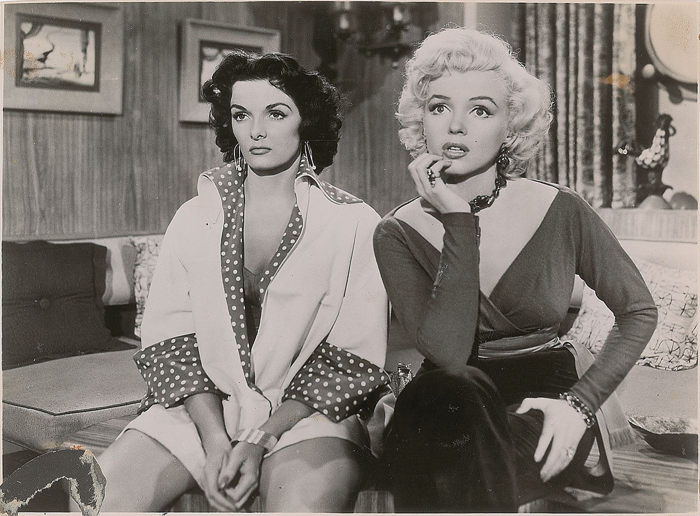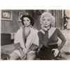 Original vintage 9.5 x 7 silver gelatin photo of Monroe and Jane Russell in the classic 1953 musical comedy Gentlemen Prefer Blondes, marked with a "Kim Goodwin" collection notation on the reverse. In very good to fine condition, with trimmed edges, a light stain to the upper right, and some old paper residue to the lower left corner.