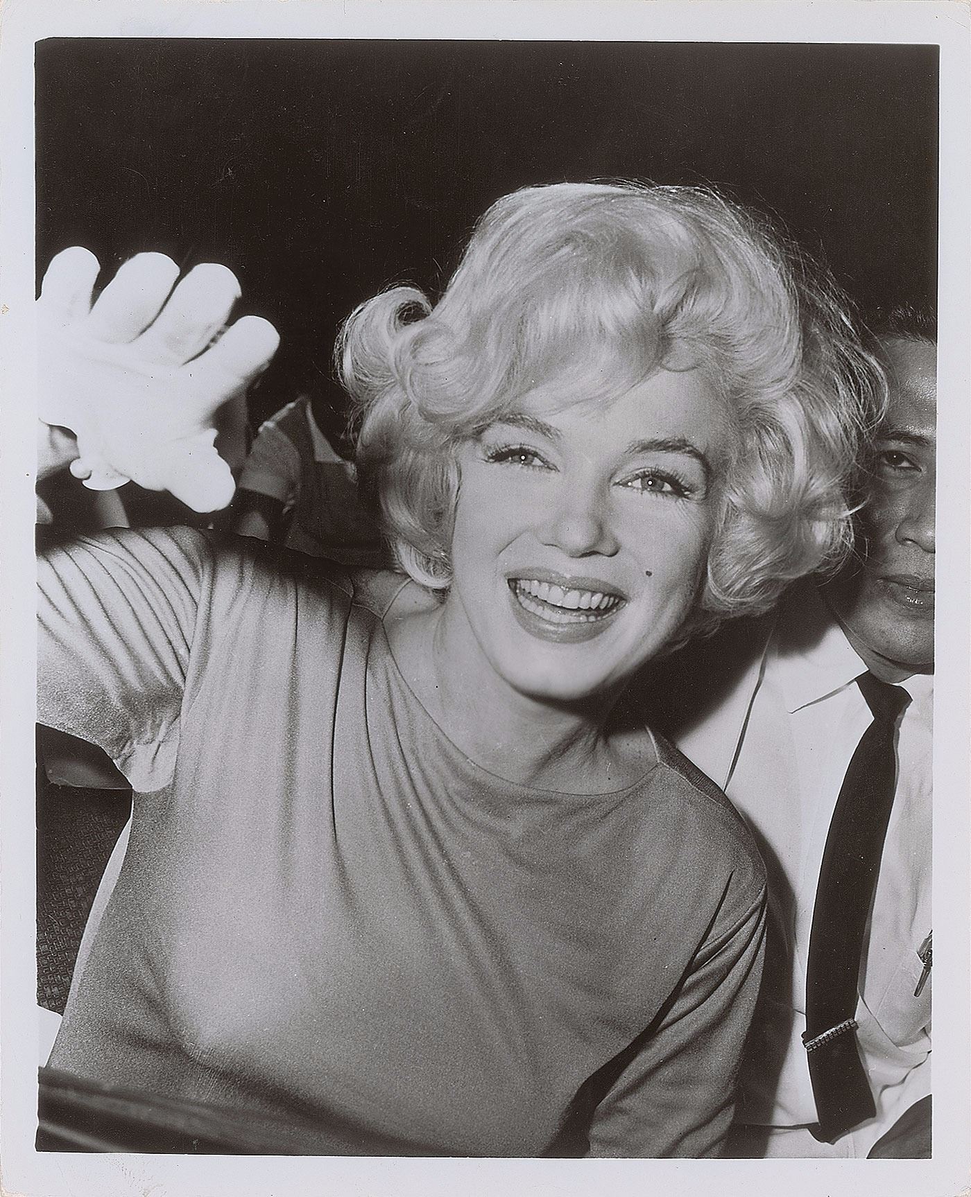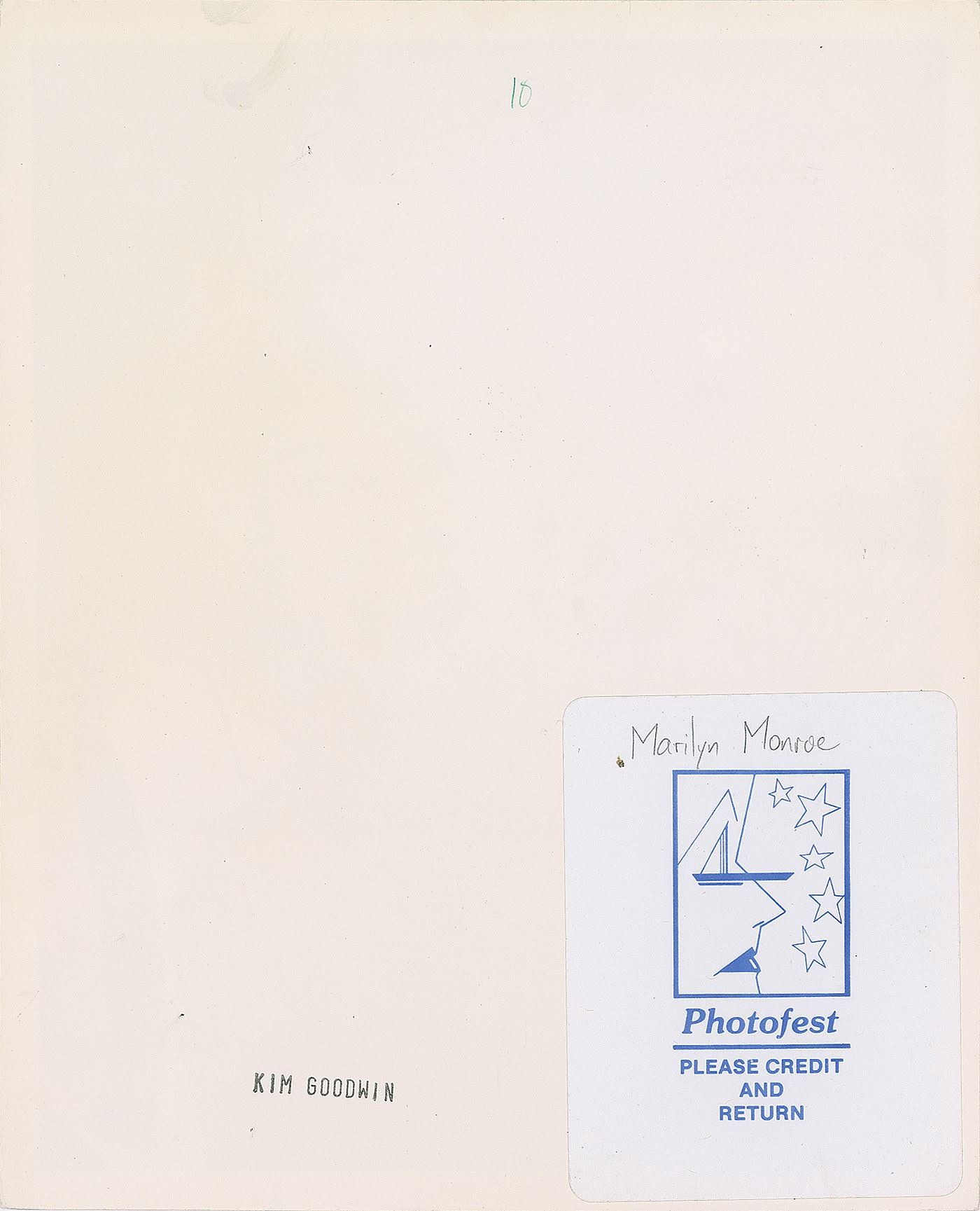 Glossy 8 x 10 silver gelatin photo of Monroe waving with a white glove, marked with a "Kim Goodwin" collection notation on the reverse. In fine condition.