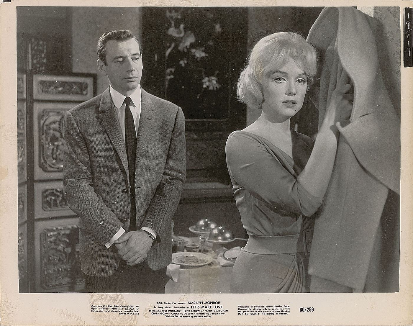 Original vintage glossy 10 x 8 silver gelatin 20th Century-Fox promotional photo of Marilyn Monroe with Yves Montand in the 1960 musical comedy film made Let's Make Love. Reverse bears a "Kim Goodwin" collection notation. In very good to fine condition, with scattered creasing, a bit heavier across the center.