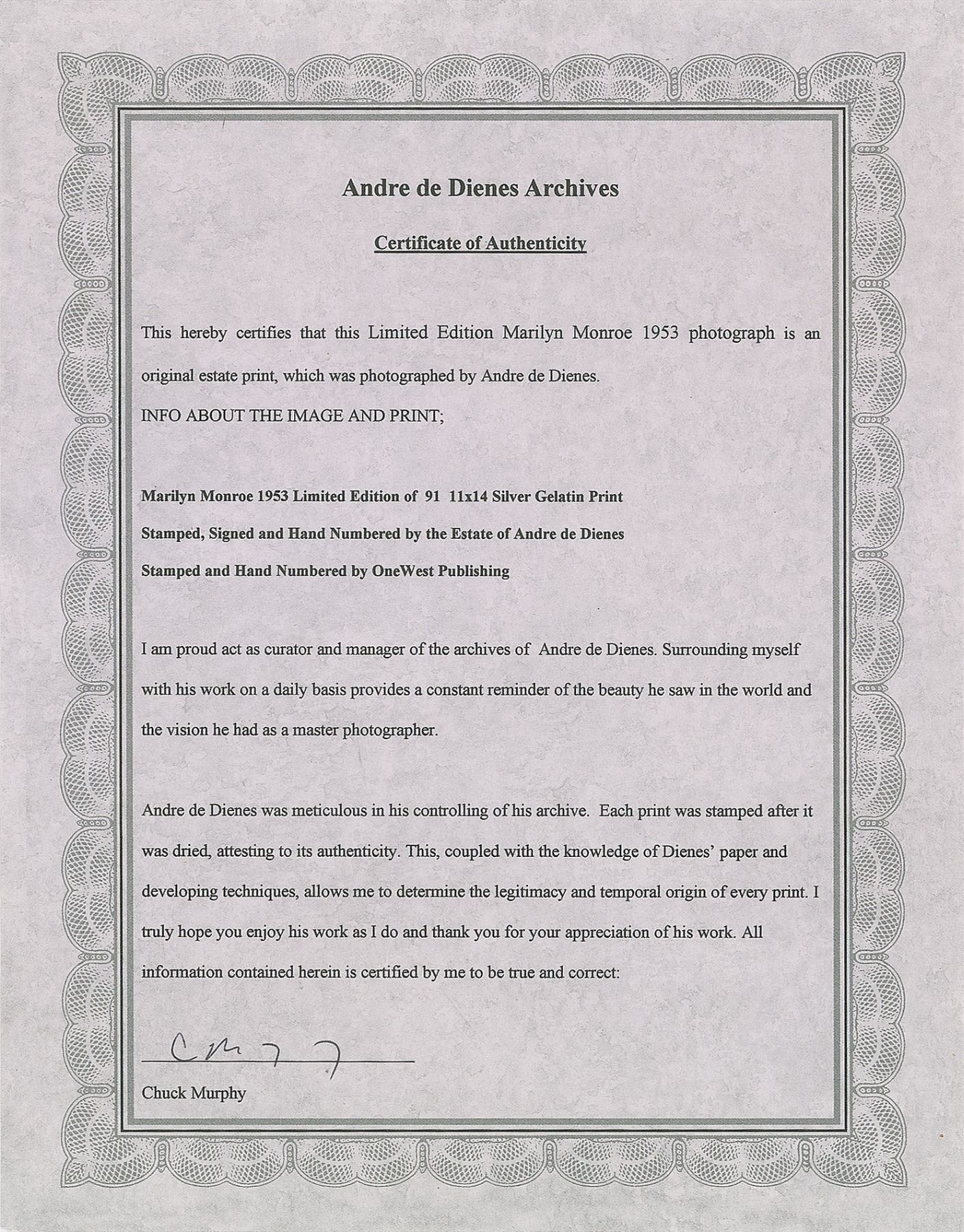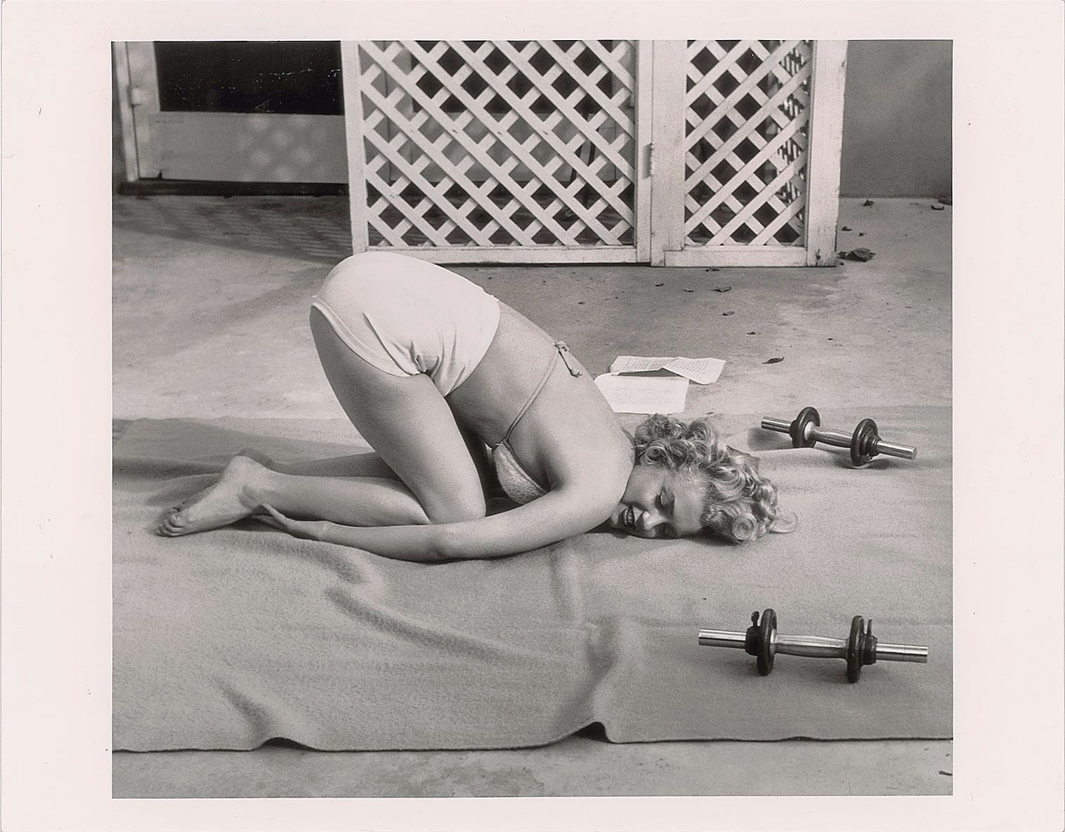 Limited edition 14 x 11 silver gelatin print of a 1953 photo taken by Andre de Dienes, printed in 2005, numbered 51/91, showing Monroe on the ground next to some weights. Reverse bears a 2005 OneWest Publishing limited edition stamp and an Andre de Dienes estate stamp. In very fine condition. Accompanied by a certificate of authenticity from OneWest Publishing.