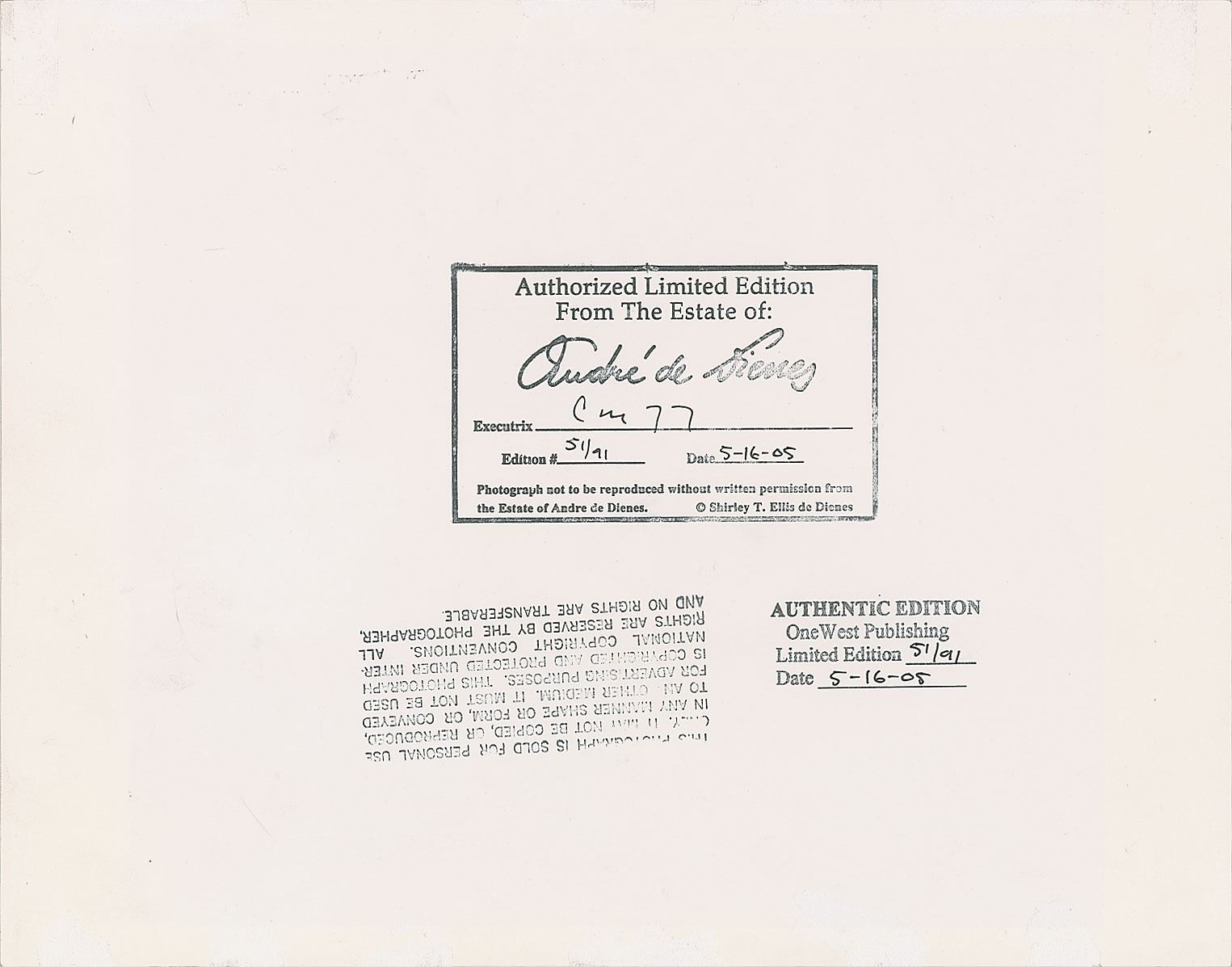 All lots sold by RR Auction are accompanied by an Auction Certificate (“AC”). On any lot presented with an AC issued by RR Auction, the certification is only as to its attribution to the person or entity described or to the lot's usage and only as explicitly stated therein (the “Certification of Authenticity”), to the exclusion of any other warranties, express or implied, including but not limited to those pursuant to the Uniform Commercial Code. The Certification of Authenticity inures only to the original Bidder (as shown in RR Auction's records). Bidder may not transfer, assign, or otherwise convey the Certification of Authenticity, and such purported transfer, assignment, or conveyance shall be null and void. The Certification of Authenticity is valid from date of the Auction in which Bidder was awarded the lot (the “Auction Date”) until five (5) years after the Auction Date, without exception.