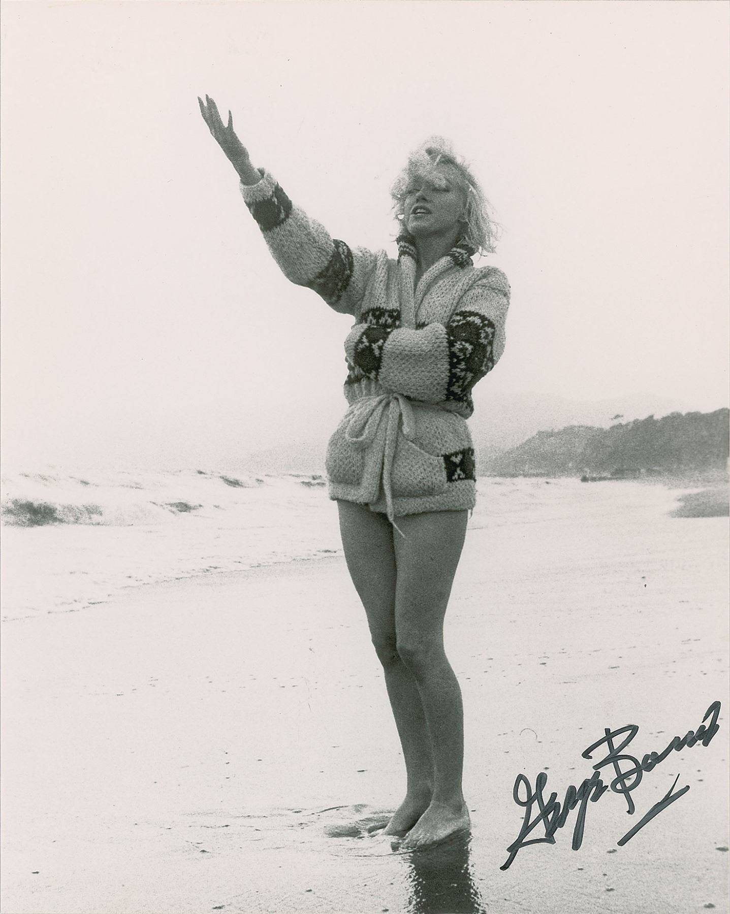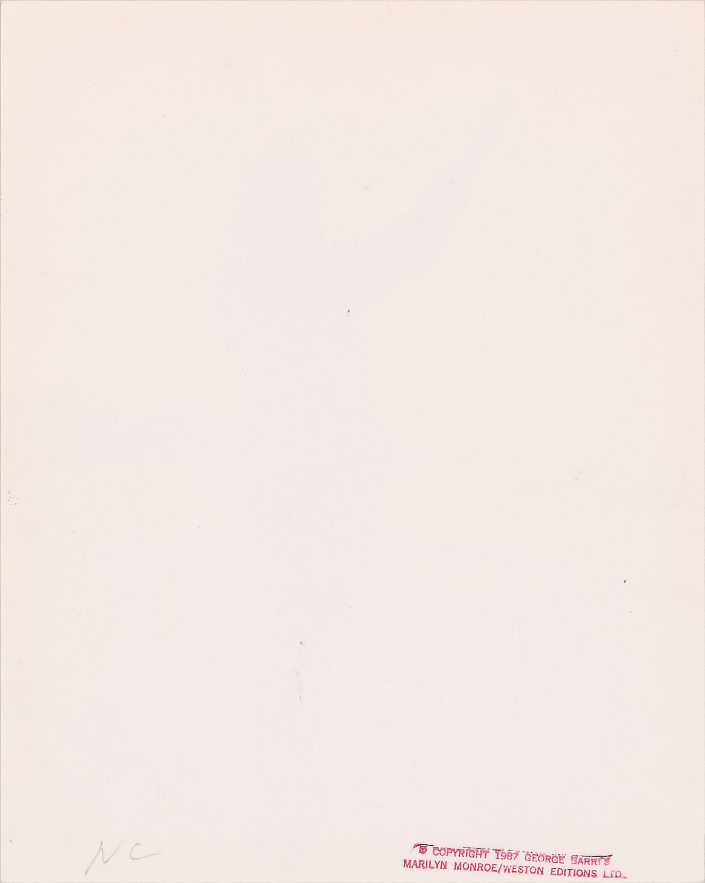 Satin-finish 8 x 10 print of Marilyn Monroe wearing a sweater on the beach taken by George Barris during Monroe's final photo shoot in 1962 and printed in the 1980s, signed in the lower right in black felt tip by Barris. Reverse bears a 1987 George Barris/Marilyn Monroe/Weston Editions copyright stamp. In very fine condition. Accompanied by a certificate of authenticity from OneWest Publishing.