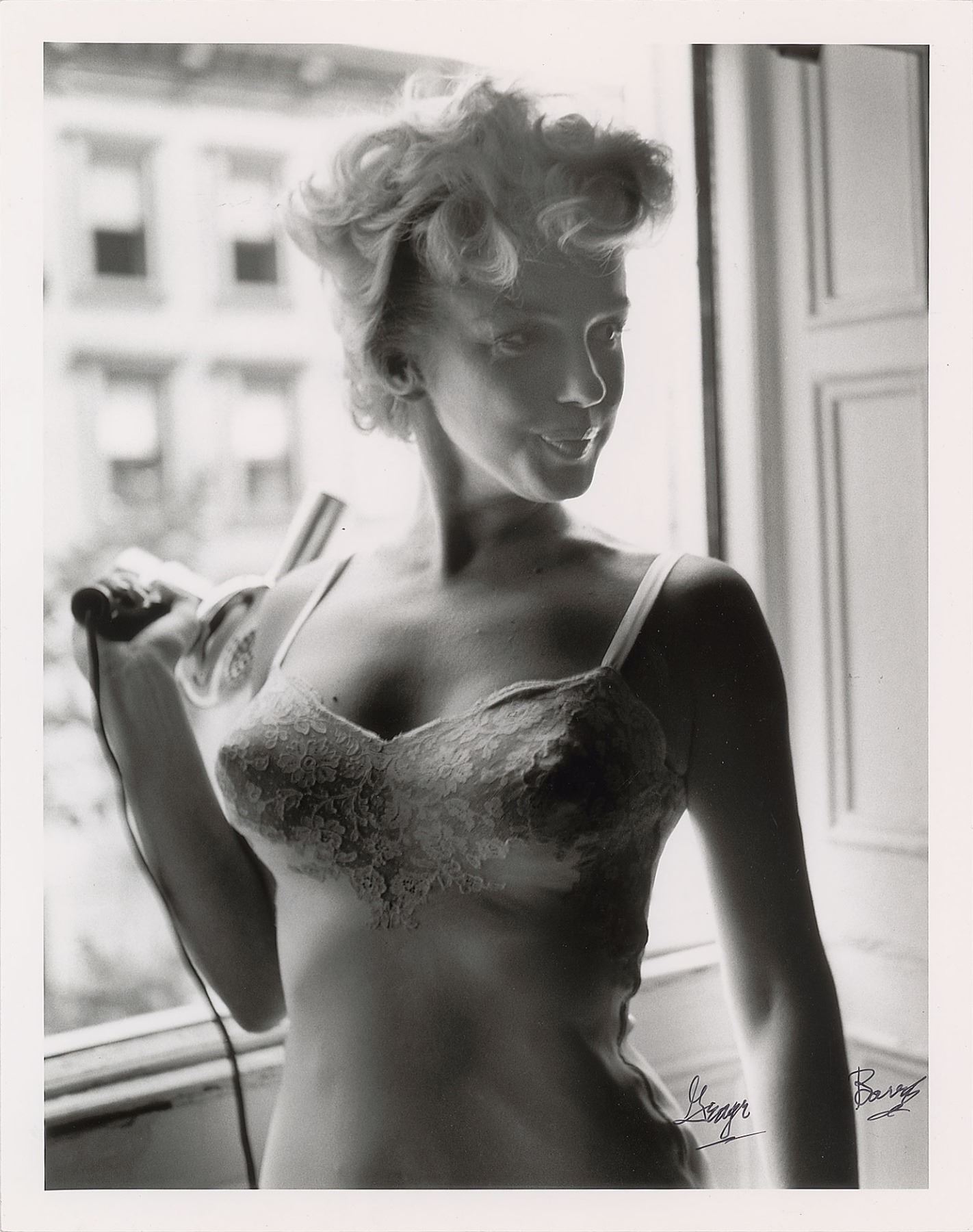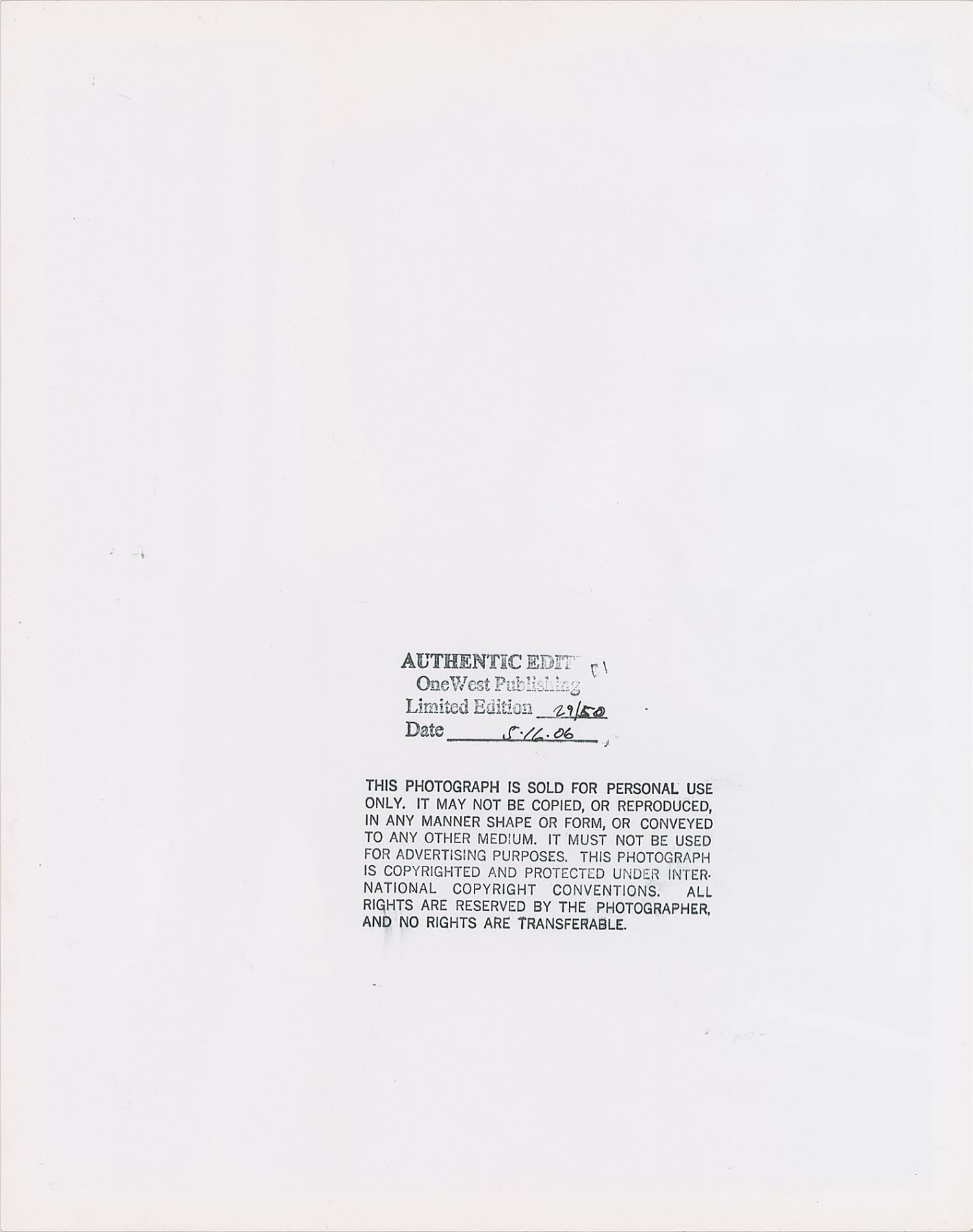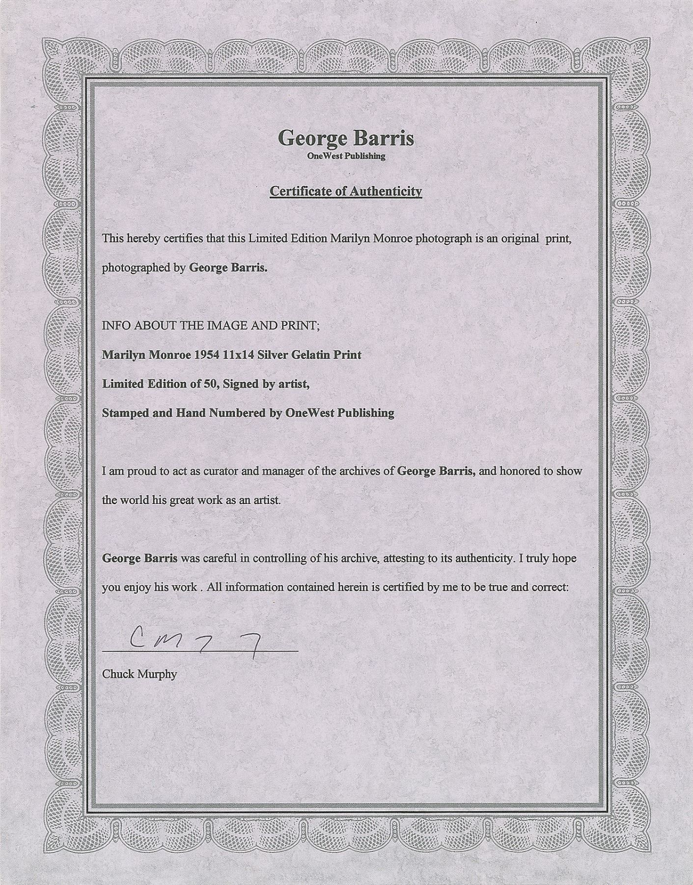 Stunning limited edition 11 x 14 silver gelatin print of a 1954 photo taken by George Barris, printed in 2006, numbered 29/50, showing Monroe in a sexy nightgown on the set of The Seven Year Itch, signed in the lower right corner in black felt tip by Barris. Reverse bears a 2006 OneWest Publishing limited edition stamp. In very fine condition. Accompanied by a certificate of authenticity from OneWest Publishing.