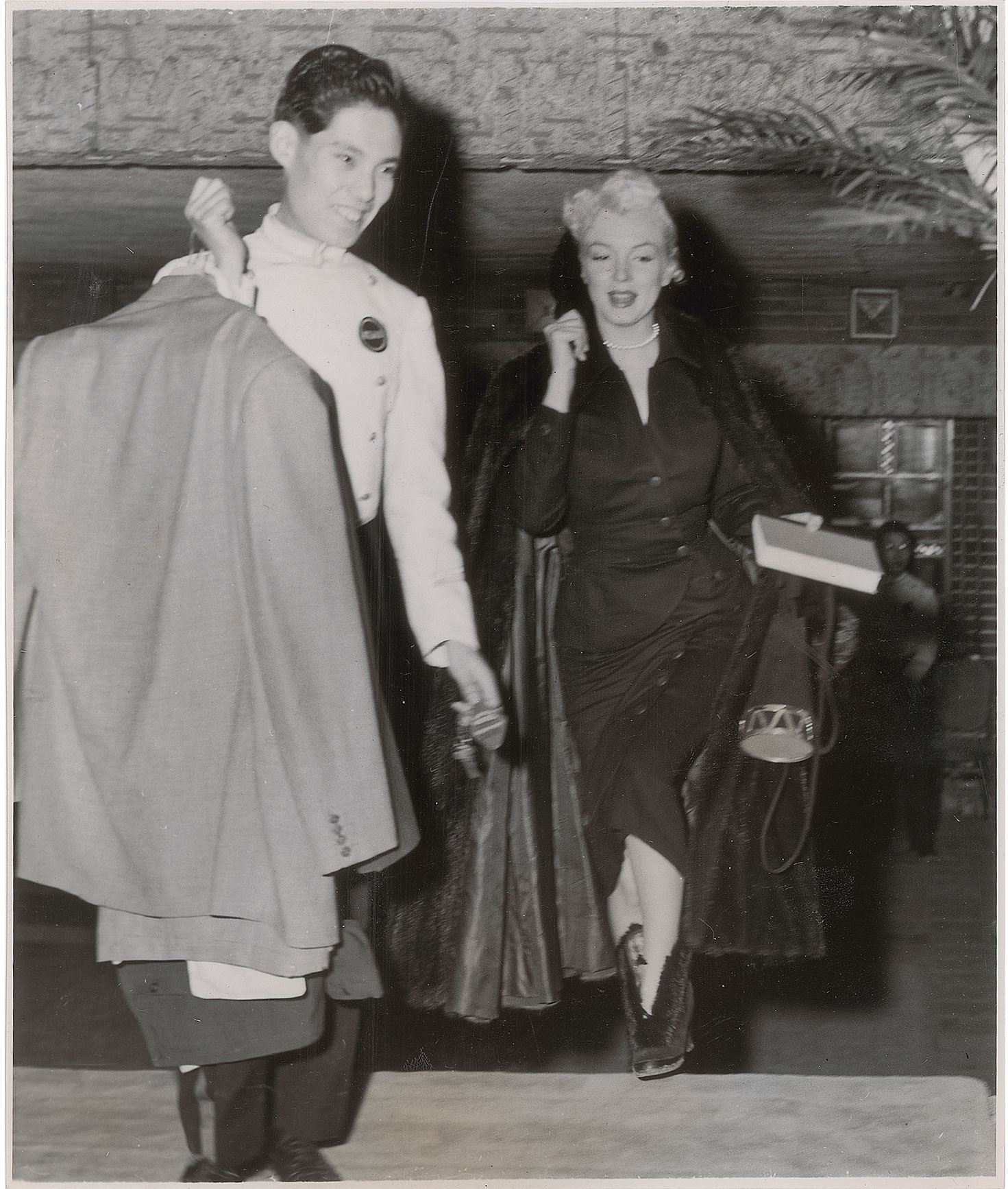 Original vintage glossy 6.5 x 7.75 silver gelatin press photo of Monroe arriving at her hotel in Tokyo in 1954, following a USO tour in Korea where she entertained American troops. Reverse bears International News Photos and King Features Syndicate stamps, as well as an affixed press caption. In fine condition.