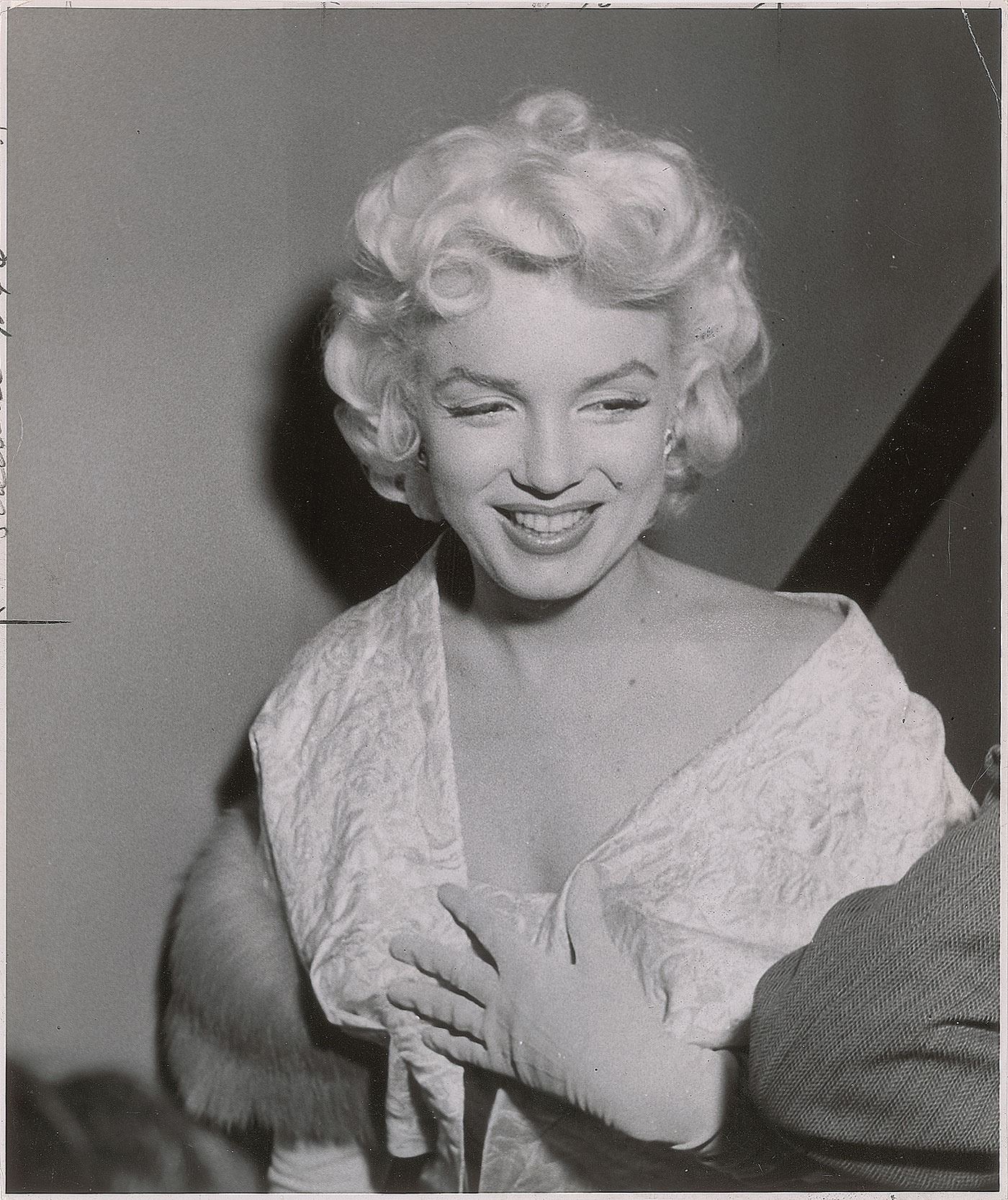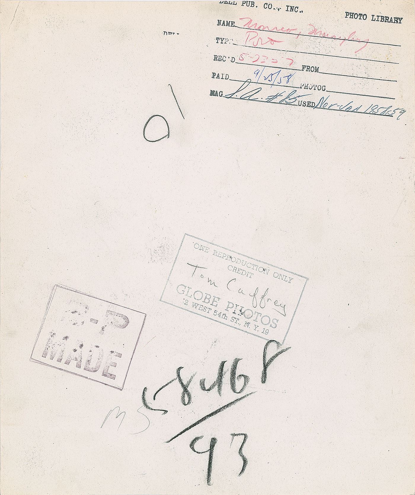 Original vintage glossy 7.75 x 9.25 silver gelatin photo of Monroe wearing a lacy shawl. Stamped on the reverse with a Globe Photos/Tom Caffrey credit stamp, and annotated with a September 1958 date. In fine condition, with trimmed edges and scattered light creasing.