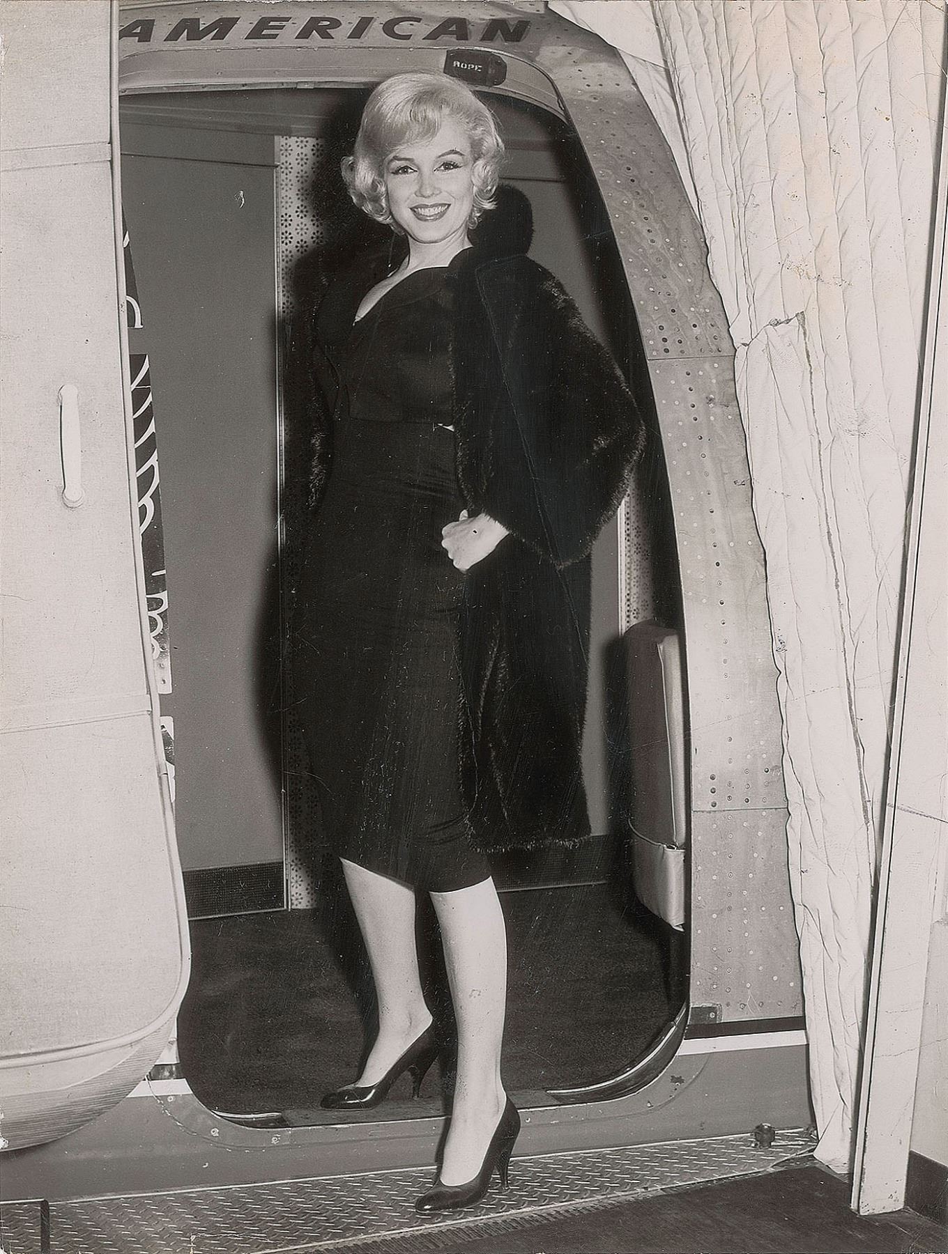 Original vintage glossy 7.75 x 10 silver gelatin photo of Monroe at Idlewild Airport en route to Hollywood to complete her role in the 1960 film Let's Make Love. Reverse bears an affixed caption and Pictorial Parade credit label. In very good to fine condition, with scattered creasing, and a rectangular surface impression from a credit sticker on the reverse.