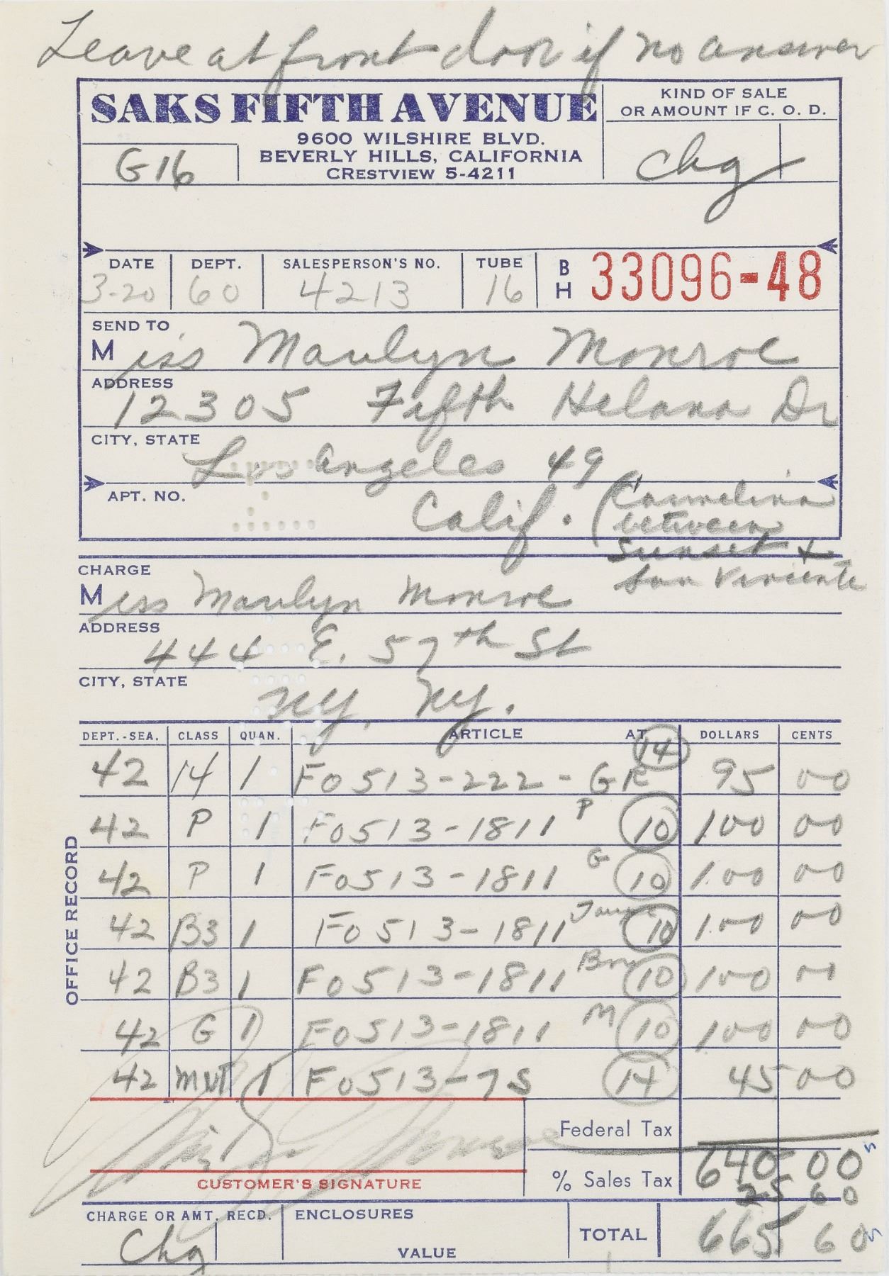 Receipt from Saks Fifth Avenue, filled out in another hand and signed at the bottom in pencil by Monroe, “Marilyn Monroe,” one page, 4.25 x 6.25, March 20, [1962]. Receipt for a purchase totaling $665.60, to be delivered to her home at "12305 Fifth Helena Dr, Los Angeles, Calif.," annotated at the top, "Leave at front door if no answer." The receipt likely relates to the purchase of multiple Pucci garments, which Marilyn was famous for wearing during her final years alive in the 1960s. Color codes are listed in the "Article" column, with sizing details ("14" and "10") circled along the right side. In fine condition.