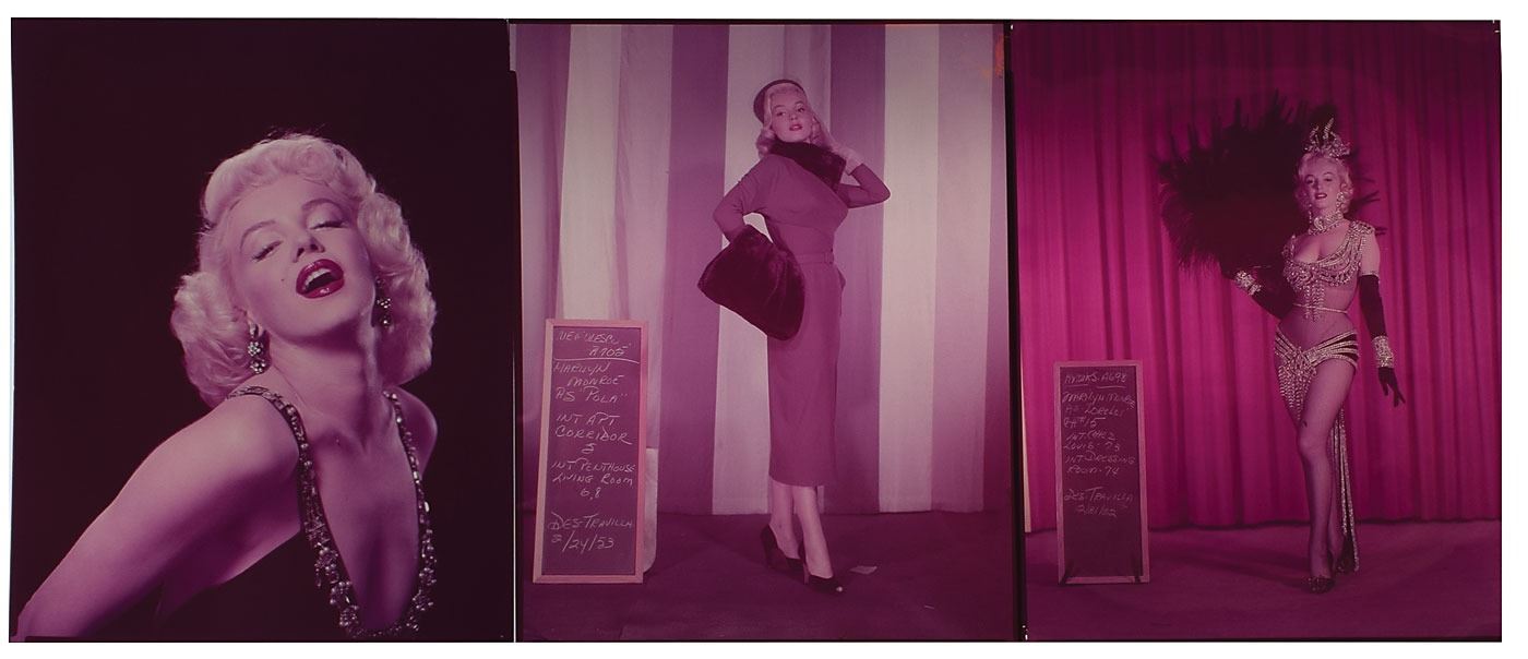 Group of five copy negatives and transparencies of Marilyn Monroe from the archive of her makeup artist, Allan 'Whitey' Snyder. Includes: a color 2.5 x 2.5 transparency of Monroe in a yellow swimsuit on the beach; a color 8 x 10 transparency of Monroe as Pola in How to Marry a Millionaire; a color 8 x 10 transparency of Monroe as Lorelei in Gentlemen Prefer Blondes; a color 8 x 10 transparency of a close-up glamour shot of Monroe; and a black-and-white 4 x 5 negative of a close-up portrait. Includes a matte-finish 8 x 10 print of the black-and-white close-up, a modern 4 x 5 print of the How to Marry a Millionaire photo, and two modern 5 x 7 prints from the yellow swimsuit shoot (one associated transparency not included). In overall fine condition. Provenance: Estate of Allan 'Whitey' Snyder, Julien's, 2012.