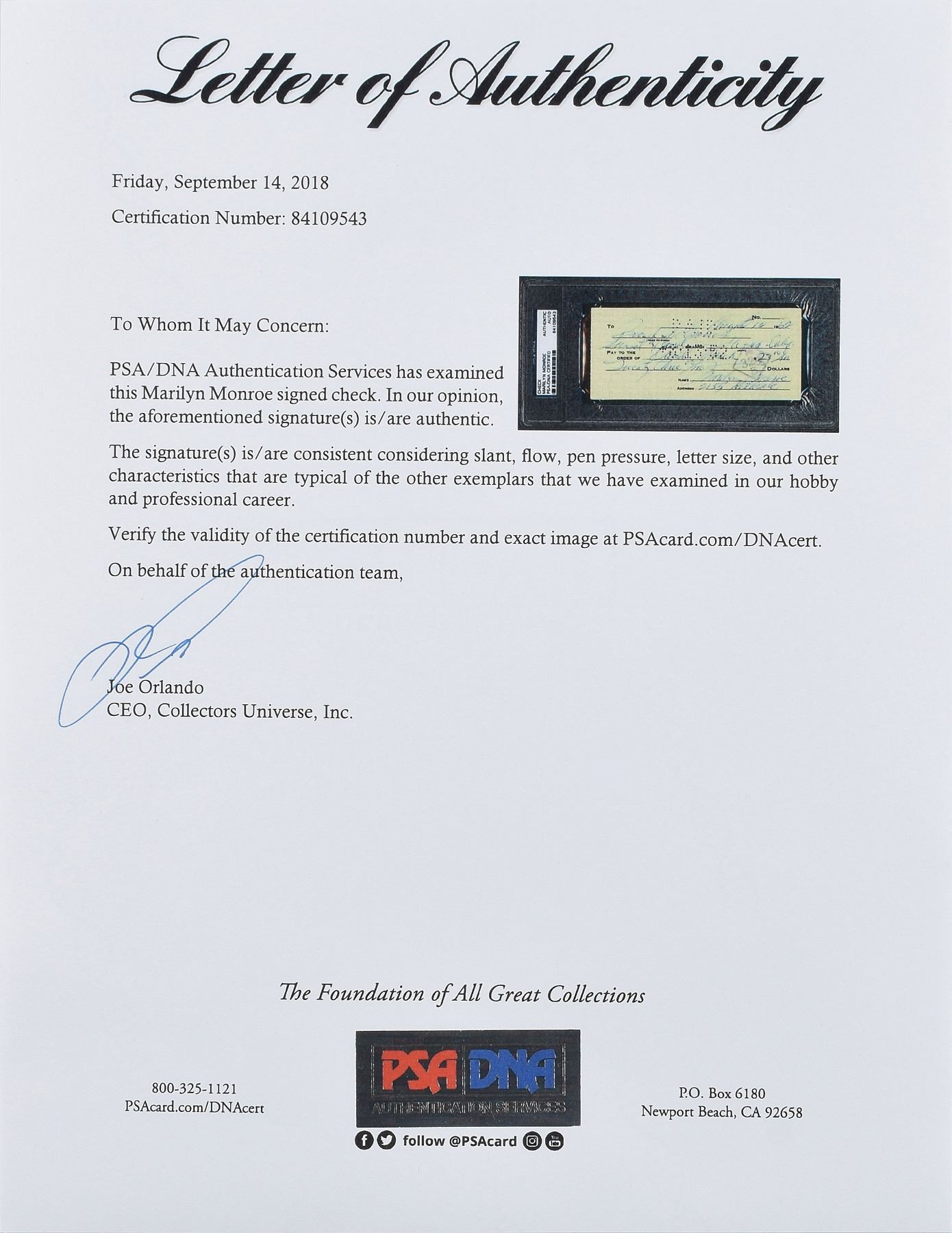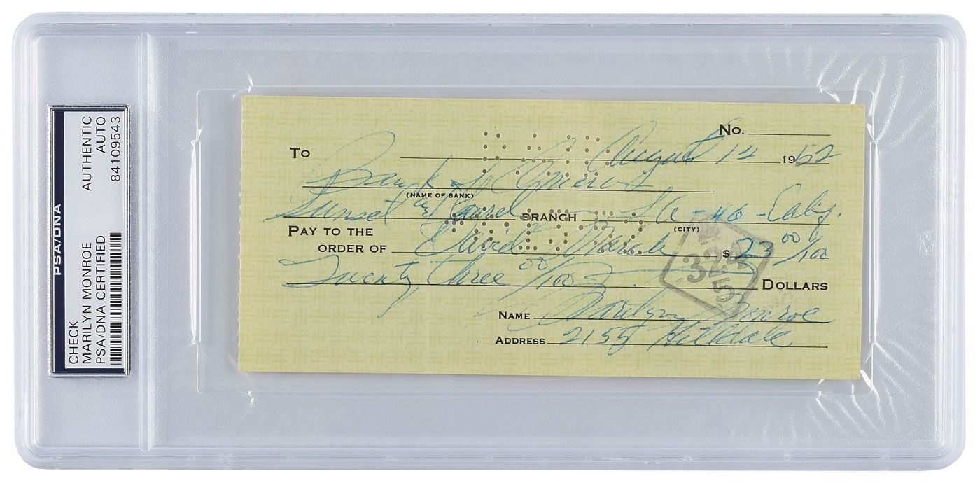 Counter check, 6.25 x 2.75, filled out and signed by Monroe, "Marilyn Monroe," payable to her publicist David March for $23, August 12, 1952. Monroe fills out the entire check in her hand, noting her bank as "Bank of America, Sunset and Laurel, LA-46-Calif." At the bottom, Monroe notes her address as "2155 Hilldale." Encapsulated in a PSA/DNA authentication holder. In fine condition. Accompanied by a full letter of authenticity from PSA/DNA and an unsigned color glossy photo of the young Monroe. Monroe had met legendary ballplayer Joe DiMaggio on a blind date—arranged by David March, the recipient of this payment—in March 1952, and the two were married two years later. A highly desirable autograph check from the Hollywood icon.