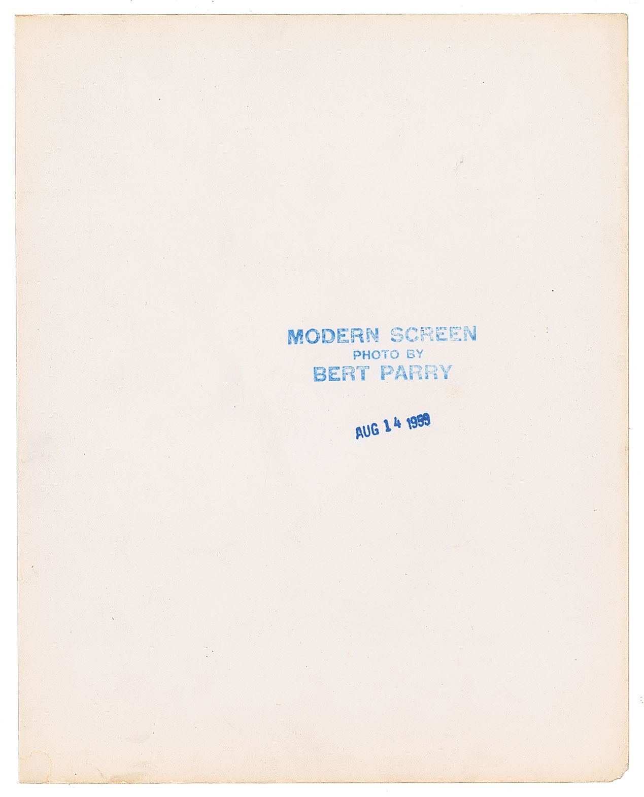 Original vintage semi-glossy 8 x 10 silver gelatin photo of Marilyn Monroe peering out of a Canadian National train. Reverse is stamp-dated August 14, 1959, and bears a Bert Parry/Modern Screen credit stamp. In fine condition, with trivial loss to the lower left corner tip.