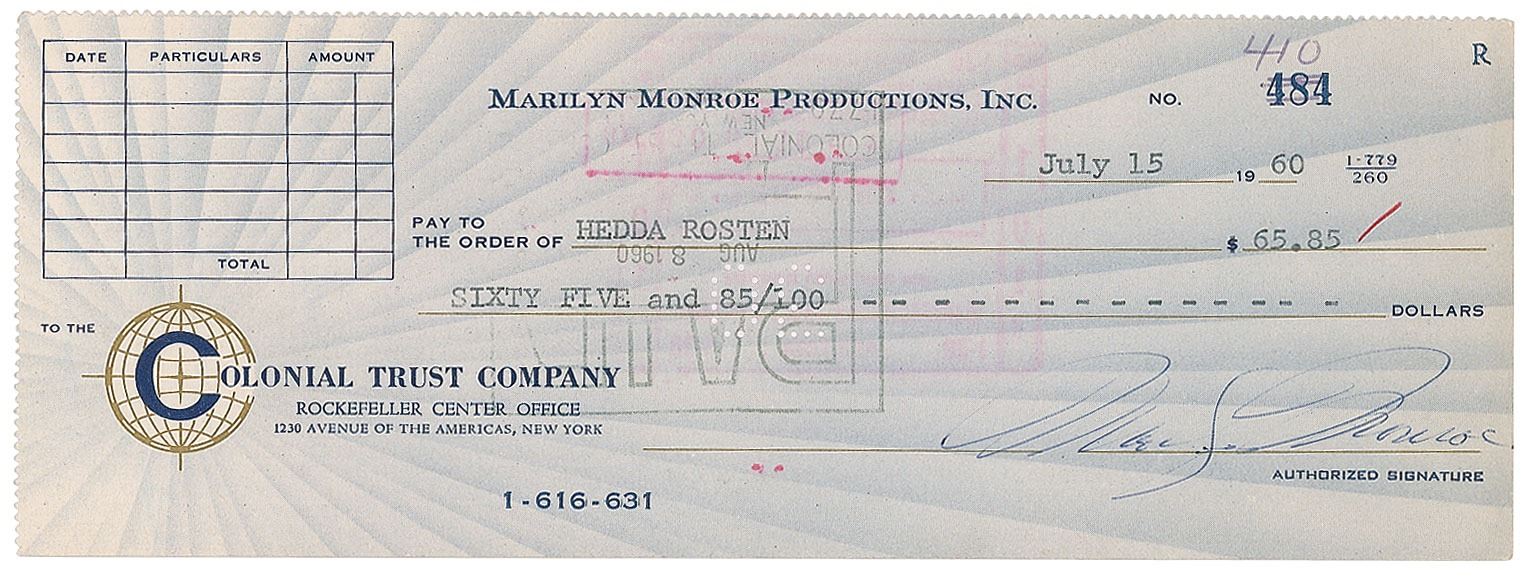 Marilyn Monroe Productions check, 8.5 x 3, filled out in type and signed by Monroe, payable to Hedda Rosten for $65.85, July 15, 1960. In fine condition. Writers Norman and Hedda Rosten first met Monroe in 1955 when their friend, legendary photographer Sam Shaw, arrived at their Brooklyn apartment with the blonde starlet by his side. Best friend and former roommate to Arthur Miller's soon-to-be ex-wife Mary, Hedda was initially hesitant to befriend Monroe, but as time passed the Rostens grew to become two of the actress' most trusted allies. When Monroe and Miller married the following year, Hedda served as her maid of honor.
