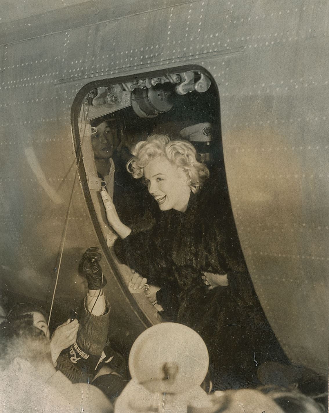 Original vintage glossy 7.25 x 9.25 silver gelatin photo of Marilyn Monroe arriving in Korea on an airplane, affixed to a same-size cardstock sheet. Reverse bears a Pictorial Parade credit stamp. In very good condition, with creasing, light silvering to some darker areas, and light discoloration to the lower half of the image.