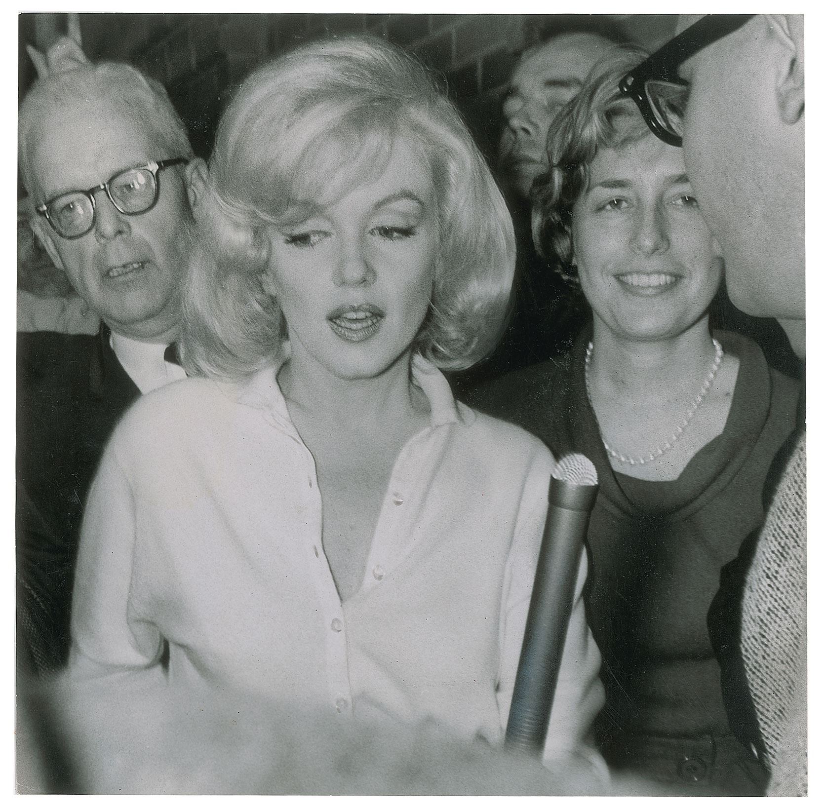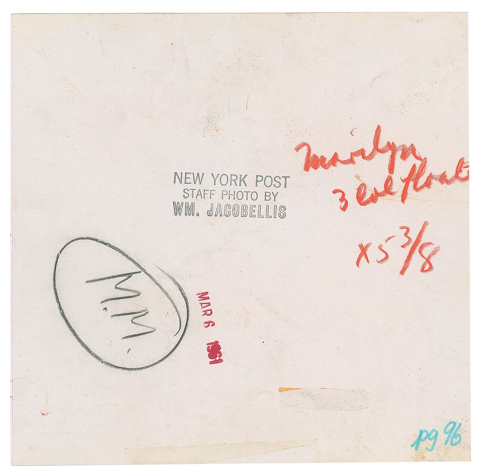 Original vintage glossy 7.75 x 7.5 silver gelatin photo of Marilyn Monroe being interviewed. Reverse is stamp-dated March 6, 1961, and bears a William Jacobellis/New York Post credit stamp. In fine condition, with trimmed edges and light spotting to the emulsion.