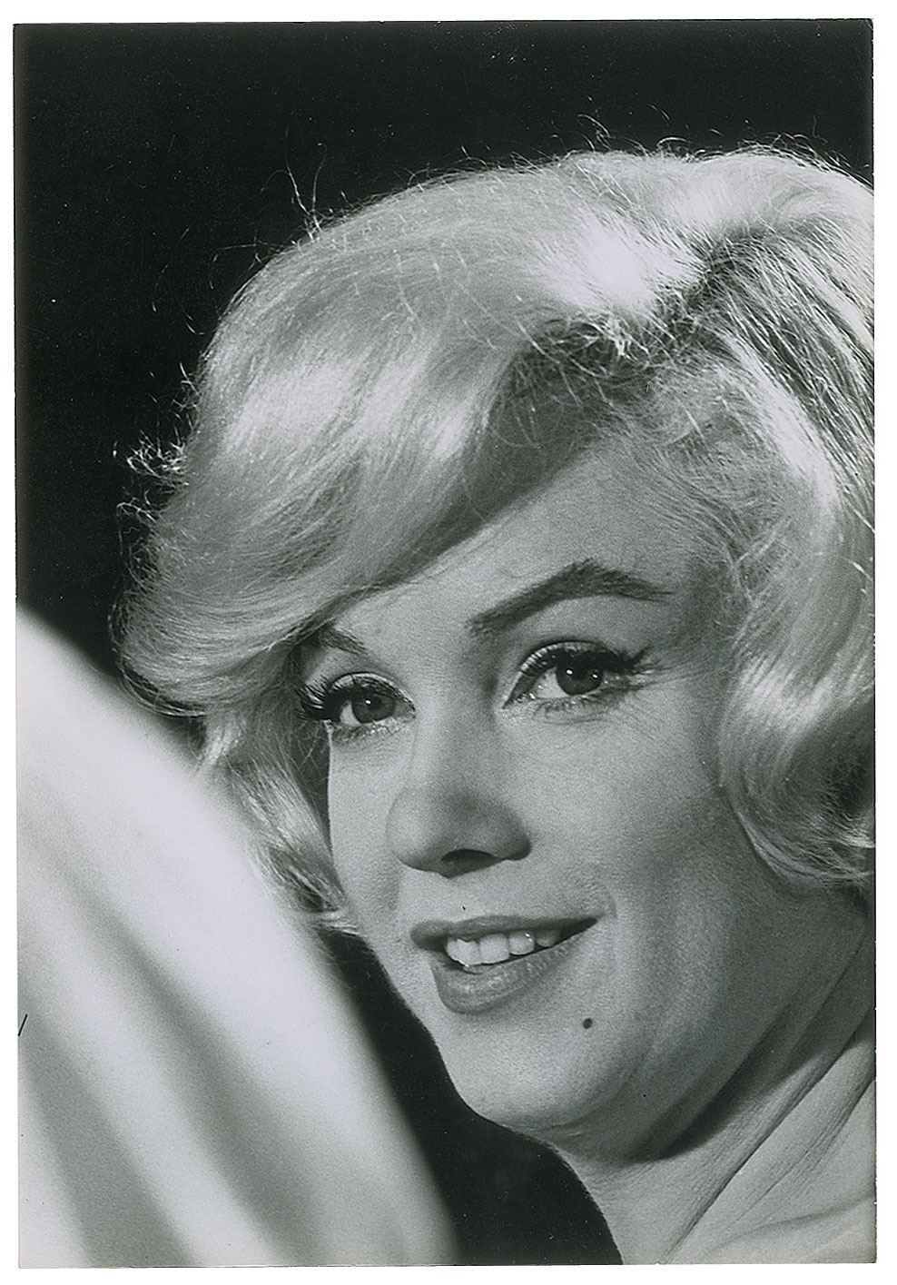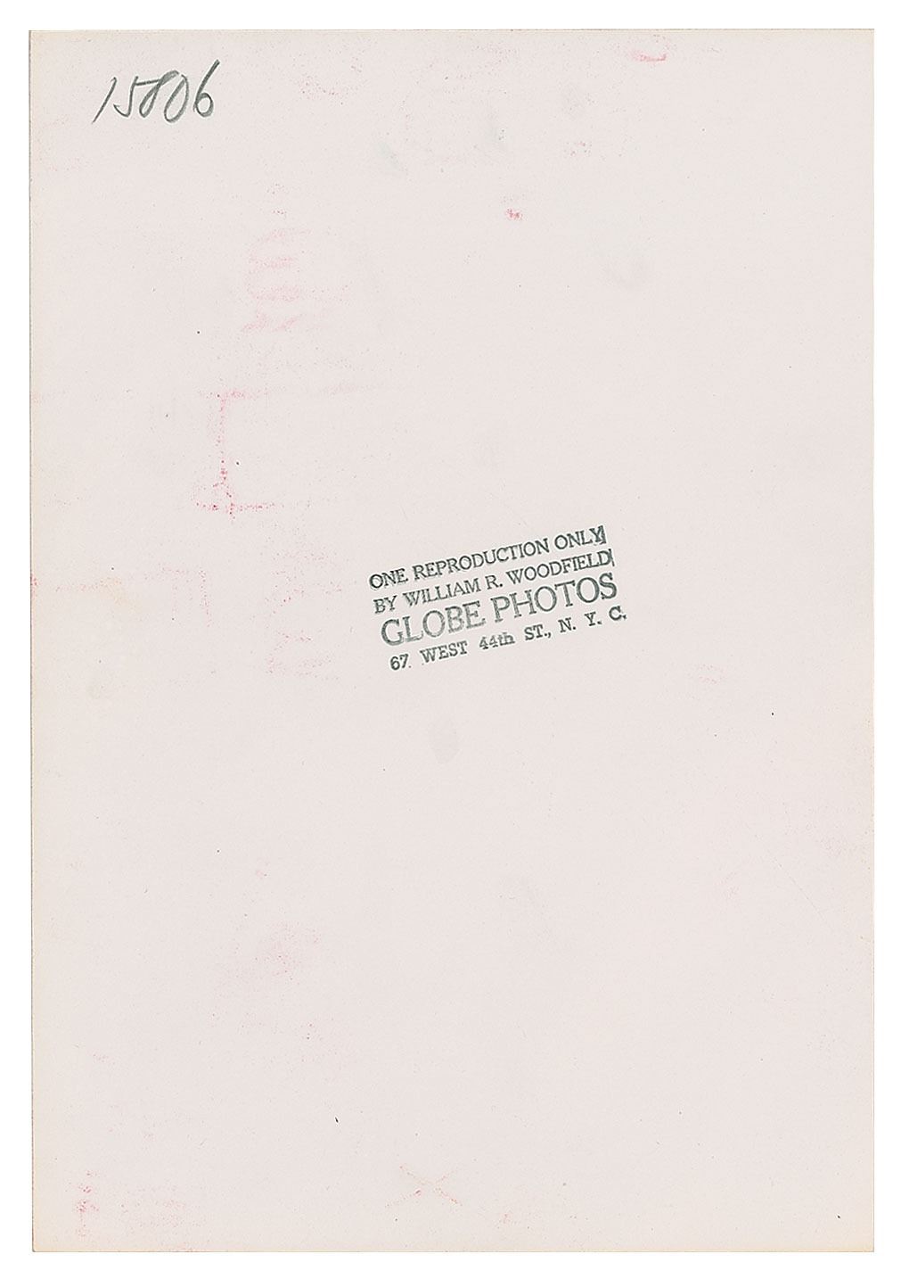 Lovely original vintage glossy 7 x 10 silver gelatin close-up photo of Marilyn Monroe. Reverse bears a William R. Woodfield/Globe Photos credit stamp. In fine condition.