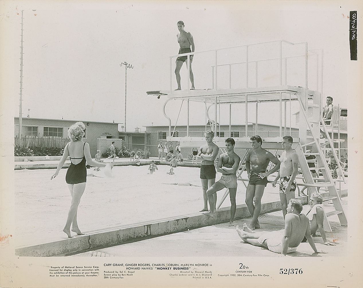 Original vintage glossy 10 x 8 publicity still from 20th Century-Fox's 1952 film Monkey Business, showing Marilyn Monroe strolling poolside in a black swimsuit as Cary Grant looks on from the diving board above. In fine condition, with staple holes around the perimeter.