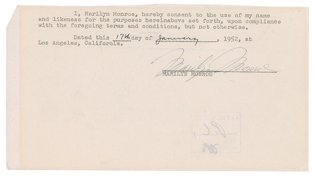 Desirable partial DS, one page, 8.5 x 4.75, January 17, 1952. The closing portion of a publicity rights contract, which reads: "I, Marilyn Monroe, hereby consent to the use of my name and likeness for the purposes hereinabove set forth, upon compliance with the foregoing terms and conditions, but not otherwise." Signed at the conclusion in black ballpoint by Monroe. In very good to fine condition, with trimmed edges, faint toning, and light fading to the signature.