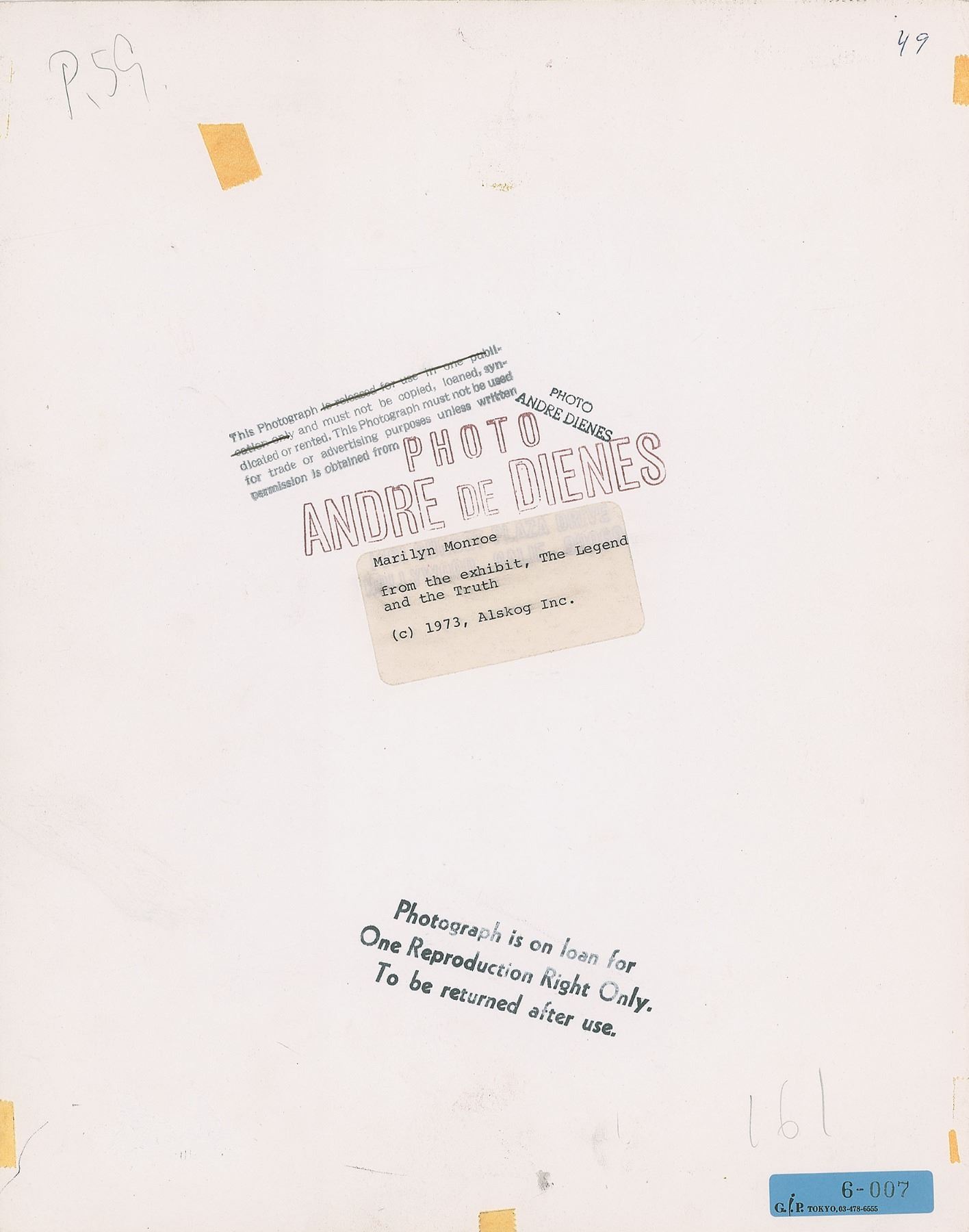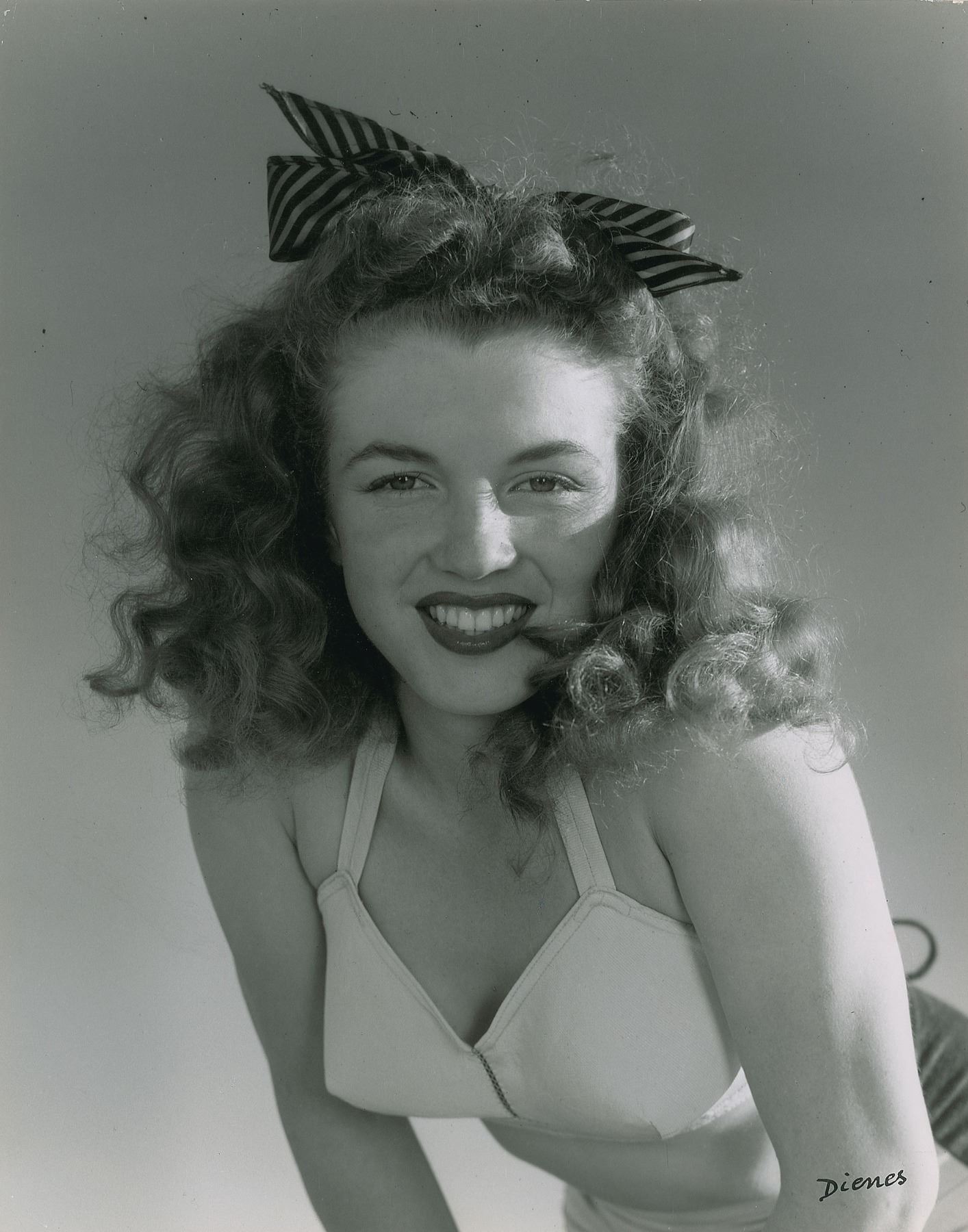 Beautiful original vintage semi-glossy 10.75 x 13.75 silver gelatin photograph of the young Marilyn Monroe in a close-up shot, taken by Andre de Dienes in 1945. Marked "Dienes" in the lower right corner, and reverse bears multiple Andre de Dienes credit stamps and a 1973 Alskog exhibition label for 'Marilyn Monroe - The Legend and The Truth.' In fine condition, with scattered small surface creases.