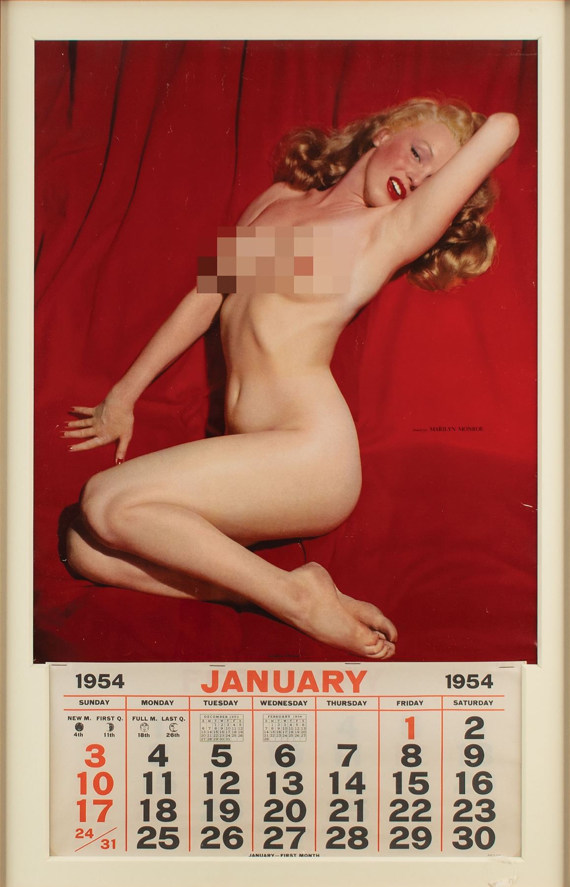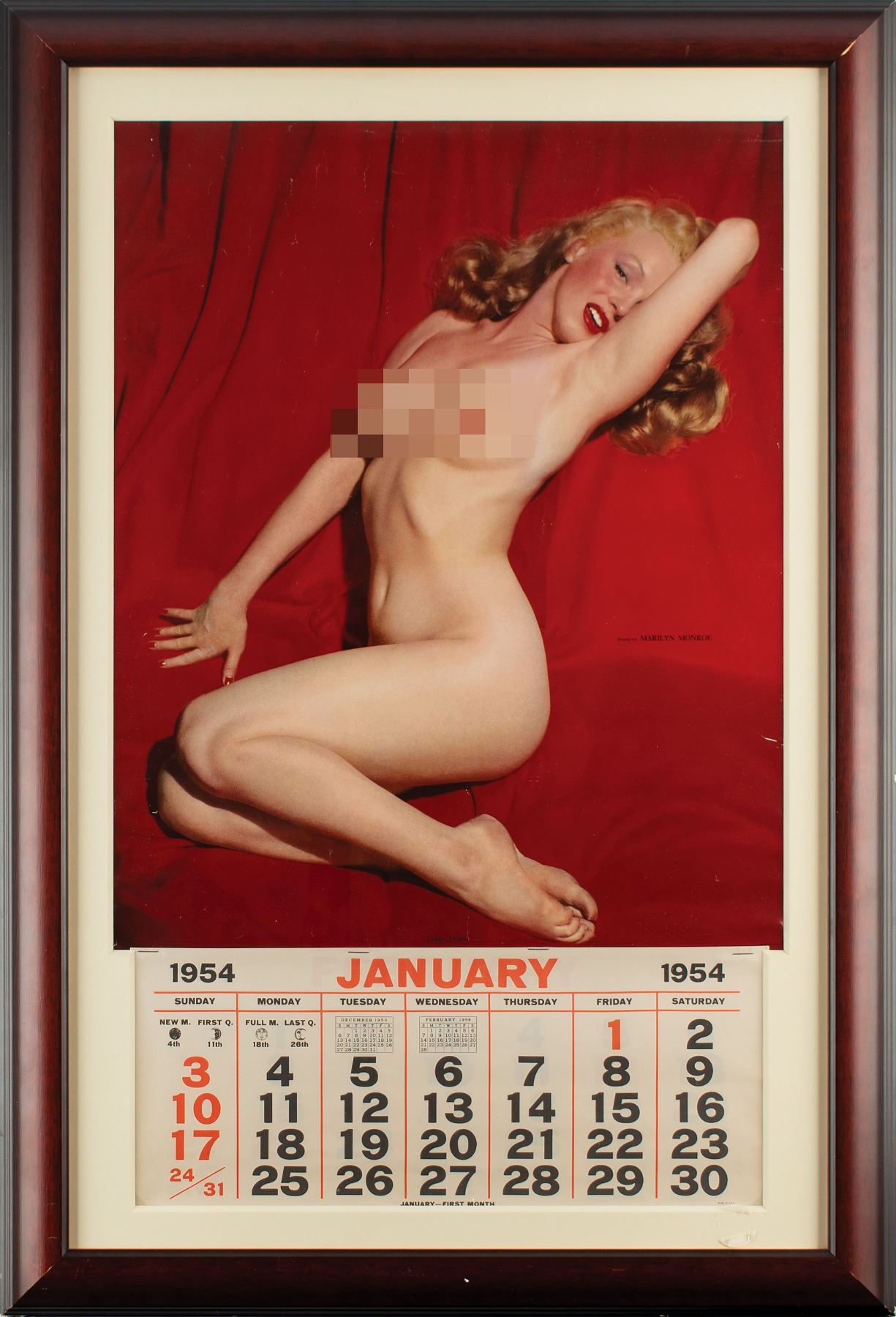 Vintage original 1954 calendar featuring a large color image of a nude Marilyn Monroe, 15.75 x 25.25, with text to right side and lower border reading: “Posed by Marilyn Monroe” and “Golden Dreams, Made in U.S.A.” Matted and framed to an overall size of 21 x 31. In very good to fine condition, with light rippled creasing to the image.