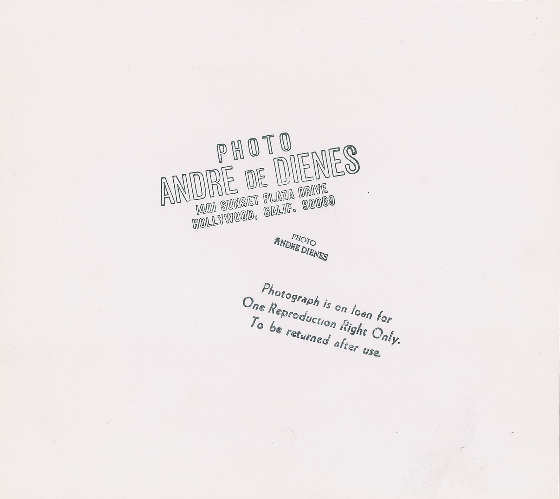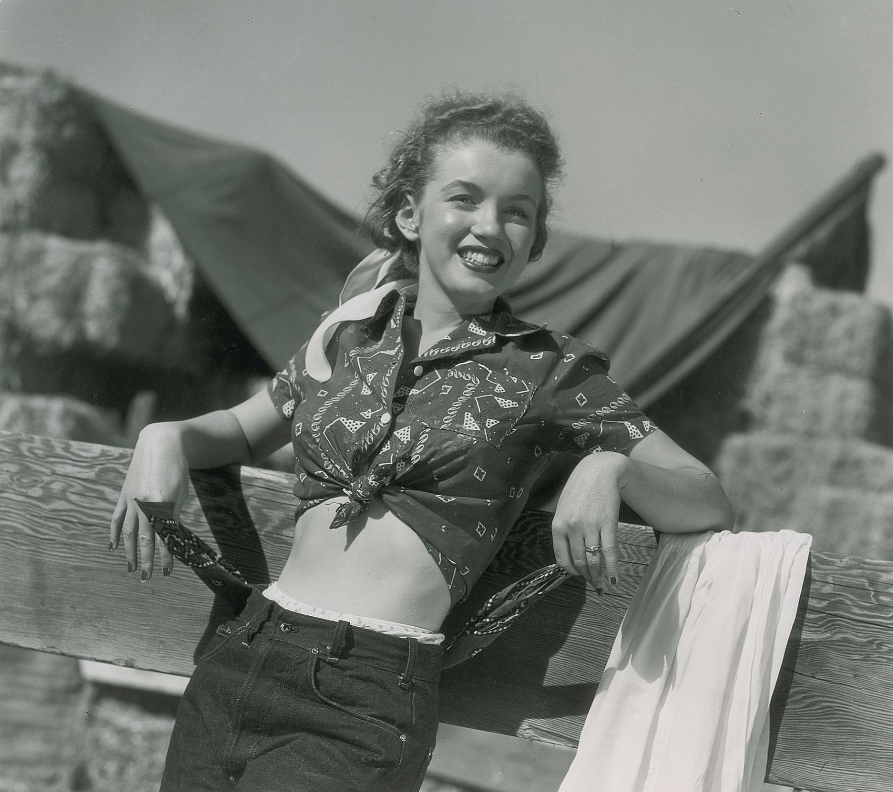 Gorgeous original vintage matte-finish 11.5 x 10.25 silver gelatin photograph of the young Marilyn Monroe posing in a farm girl outfit with her shirt tied into a knot, taken by Andre de Dienes in 1945. Reverse bears multiple Andre de Dienes credit stamps. In fine condition.