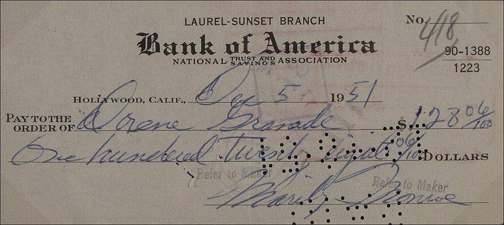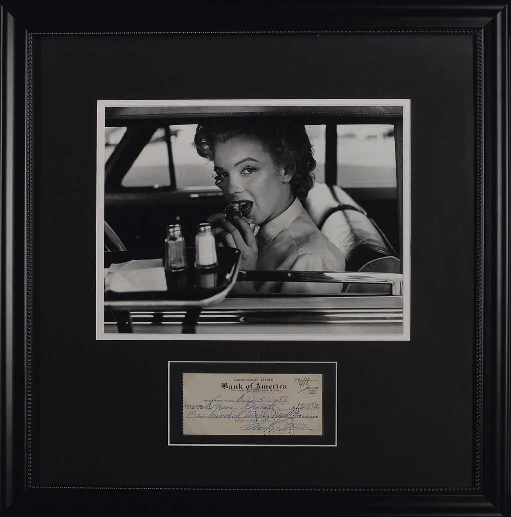 Bank check, 6 x 2.5, filled out and signed by Monroe, payable to Dorene Granade for $128.06, December 5, 1951. Matted and framed with a great Halsman photo of Monroe seductively eating a hamburger in her car, to an overall size of 22 x 22.25. The reverse of the photo (originally taken in 1952 and later printed from the negative) bears a Halsman copyright stamp, specifying it as #81 of a limited edition of 250. Cancellation holes lightly affecting portions of signature, staple hole to body, and light show-through from stamps on reverse of check, otherwise fine condition.