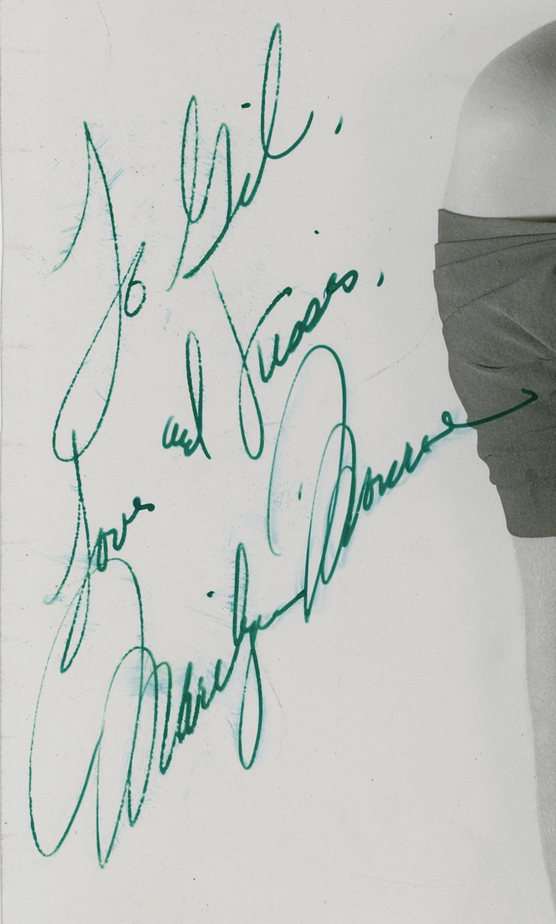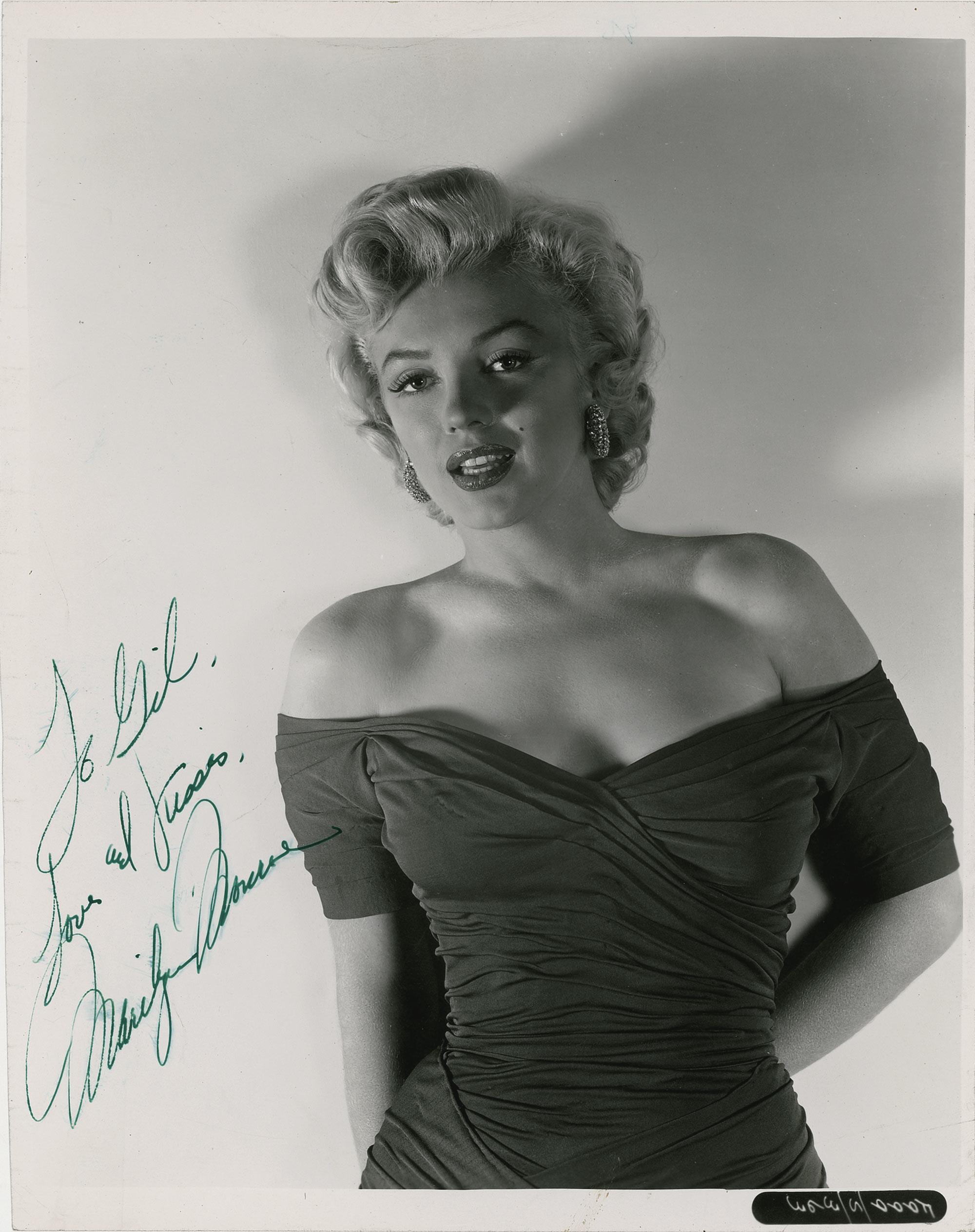 Vintage glossy 8 x 10 portrait of Monroe in a typically sultry pose and wearing an off-the-shoulder dress, signed and inscribed in green ink, “To Gil, Love and Kisses, Marilyn Monroe.” In fine condition, with scattered marks and creases, trimmed edges, and deep impressions over her name. A truly stunning pose!