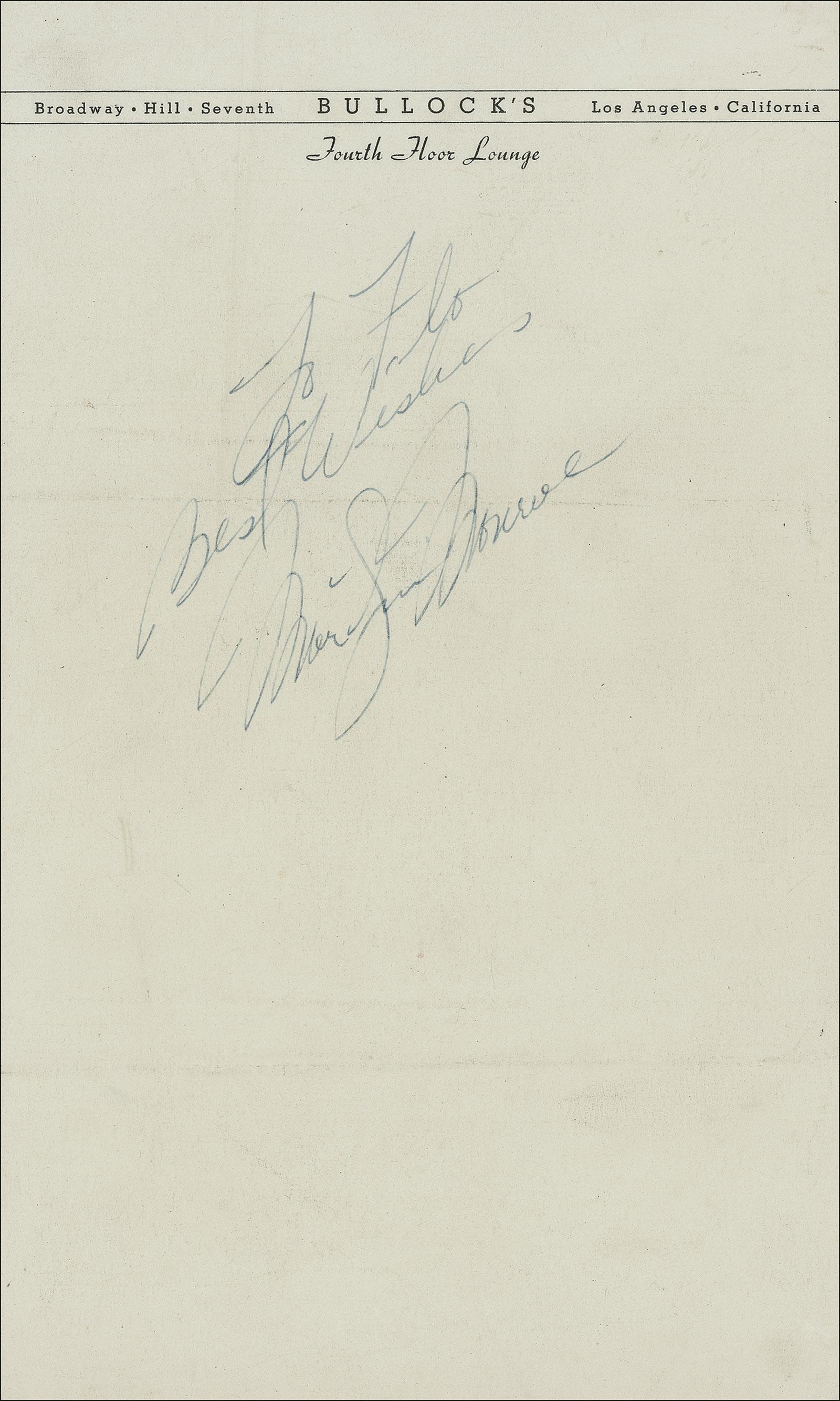 Vintage ink signature and inscription, “To Flo, best wishes, Marilyn Monroe,” on an off-white 6 x 10 sheet of Bullock’s Los Angeles Fourth Floor Lounge stationery. In fine condition, with two light horizontal folds, one lightly through a few letters of signature, and a few trivial wrinkles.