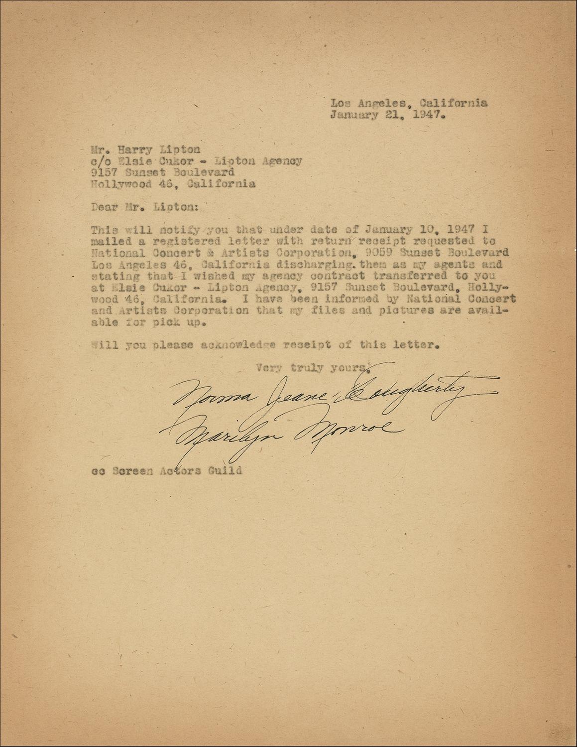 Incredible DS, signed as both “Norma Jeane Dougherty” and “Marilyn Monroe,” one page, 8.5 x 11, January 21, 1947. Monroe informs Harry Lipton at the Elise Cukor-Lipton Agency of the transfer of her contract. In full: “This will notify you that under date of January 10, 1947 I mailed a registered letter with return receipt requested to National Concert & Artists Corporation, 9059 Sunset Boulevard, Los Angeles 46, California discharging them as my agents and stating that I wish my agency contract transferred to you at Elise Cukor-Lipton Agency, 9157 Sunset Boulevard, Hollywood, California. I have been informed by National Concert and Artists Corporation that my files and pictures are available for pick up. Will you please acknowledge receipt of this letter.” Document has been removably archivally sleeved in acid free Mylar. In very good condition, with uniform moderate toning to the page, a bit heavier at edges, not detracting at all from the crisp and precise signatures.