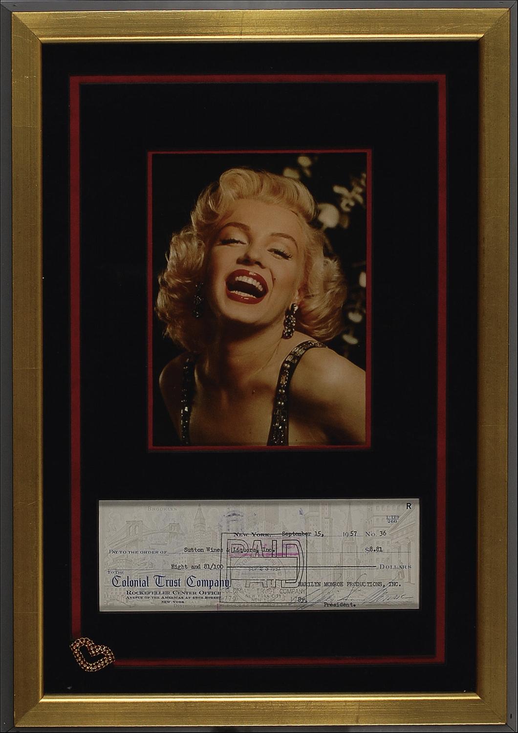 Bank check, 8.25 x 3, filled out in type and signed in blue ballpoint by Monroe, as president of Marilyn Monroe Productions, payable to Sutton Wines & Liquors, Inc. for $8.81, September 15, 1957. Matted and framed, with a color glossy photo of Monroe and a small sequined lip pin, to an overall size of 13.25 x 19. In fine condition, with bank stamp to body, lightly affecting beginning of signature, show-through from stamps on reverse, and a few strokes of signature a shade light, but completely legible. 1957 was a very up and down year for Monroe, with the release of The Princess and the Showgirl in June, the first film from Monroe’s production company, a career highlight, but just six weeks before signing this check, Monroe suffered a miscarriage.