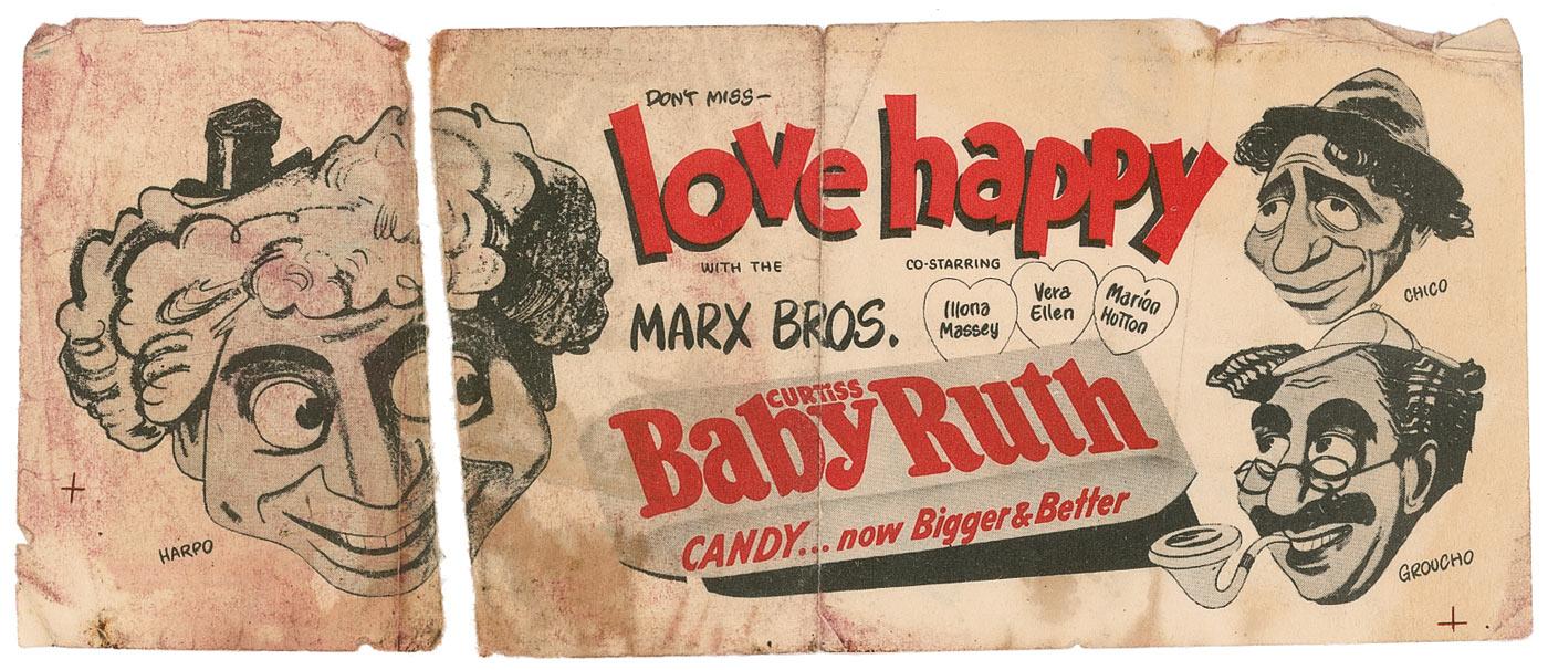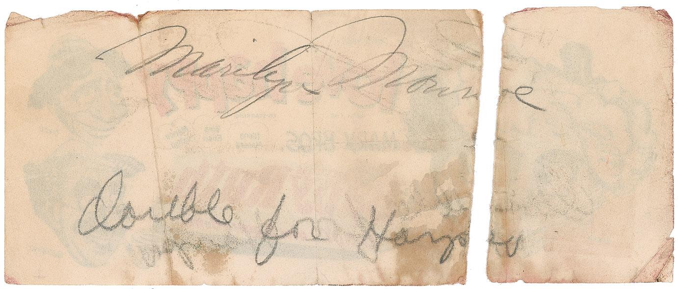 Vintage pencil signature, “Marilyn Monroe,” on the reverse of an off-white 7 x 3 promotional slip for the Marx Brothers film, Love Happy. Slip is also signed in pencil by Harpo Marx’s film double, “Double for Harpo.” Consignor notes signature was obtained in the lobby of the State Theater in Rockford, Illinois before the pre-premiere of Love Happy. In fair to good condition, with a complete vertical separation to right side, separating several letters of last name from remainder of signature, other intersecting folds lightly affecting signature, scattered toning and soiling, and several small edge tears. Accompanied by a photocopied newspaper photo from the June 15, 1949, issue of the Rockford Register Public showing Monroe meeting several children at the Children’s Home of Rockford, with several of the children holding similar slips. Marilyn’s signature remains bold and legible, and with the strong provenance, and perhaps a bit of professional restoration, would make a fine addition to any collection.