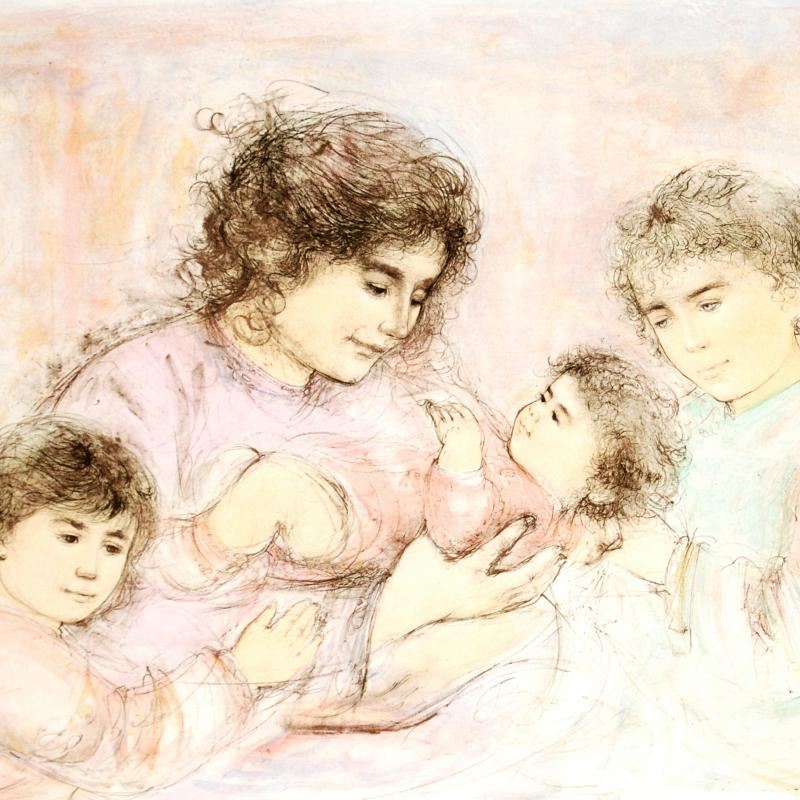 "Marilyn and Children" is a limited edition lithograph on paper, numbered and hand signed by Edna Hibel (1917-2014). Includes Certificate of Authenticity! Measures approx. 41.5" x 30" (with border), 37" x 27" (image).