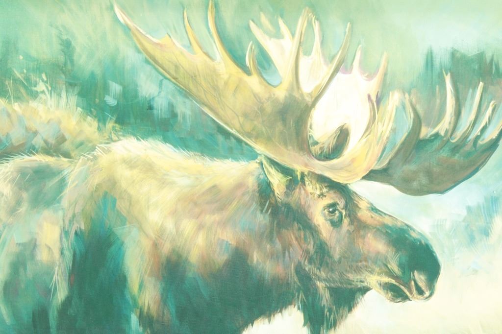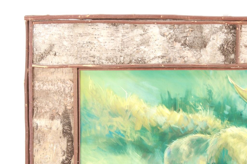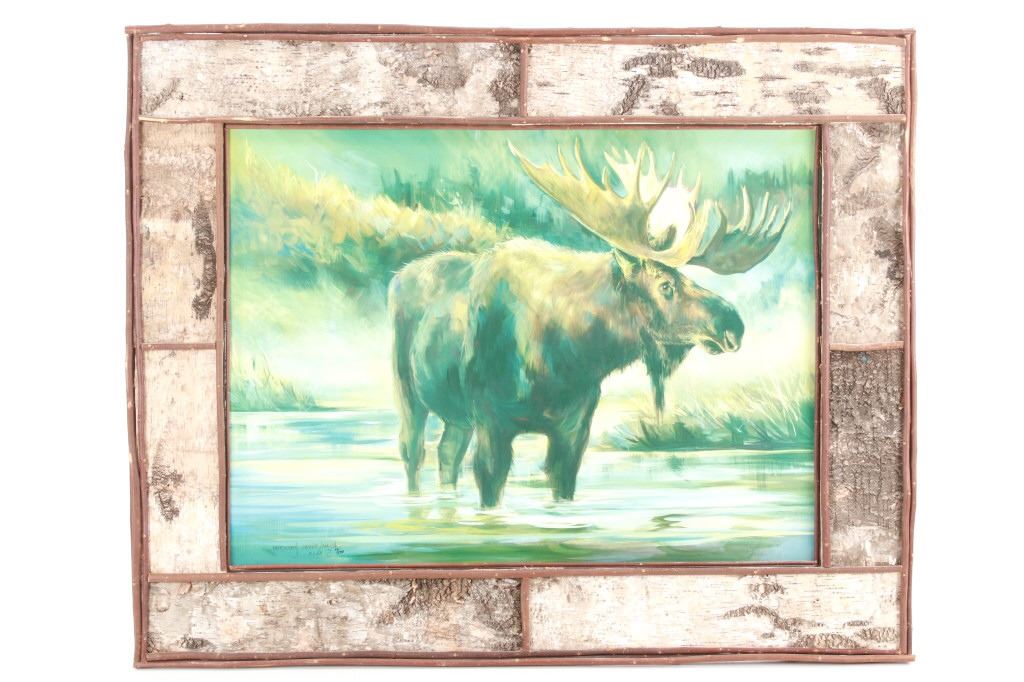 Featured in limited edition Marilynn Dwyer Mason giclee titled "Bull Moose," and set to a birchbark frame and circa 2005. Marilynn Dwyer-Mason American artist located in Southwest Montana and is an accomplished artist and Illustrator she is a master in pastel, watercolor, acrylic, oil, and pen & ink. This piece depicts a scene of a majestic bull moose standing in a creek with a woodland background behind the creek. The color scheme denotes early morning sun that is shining off the antlers and the surrounding environment. The artwork is signed in the bottom left hand corner as follows: Marilynn Dwyer Mason - 2005 - 33/500. The condition of this framed giclee is good with no obvious signs of damage to the artwork or the frame and in good overall condition. The measurements of this framed giclee is 42" x 52" and the visible artwork measures 28 3/4" x 38 1/2".