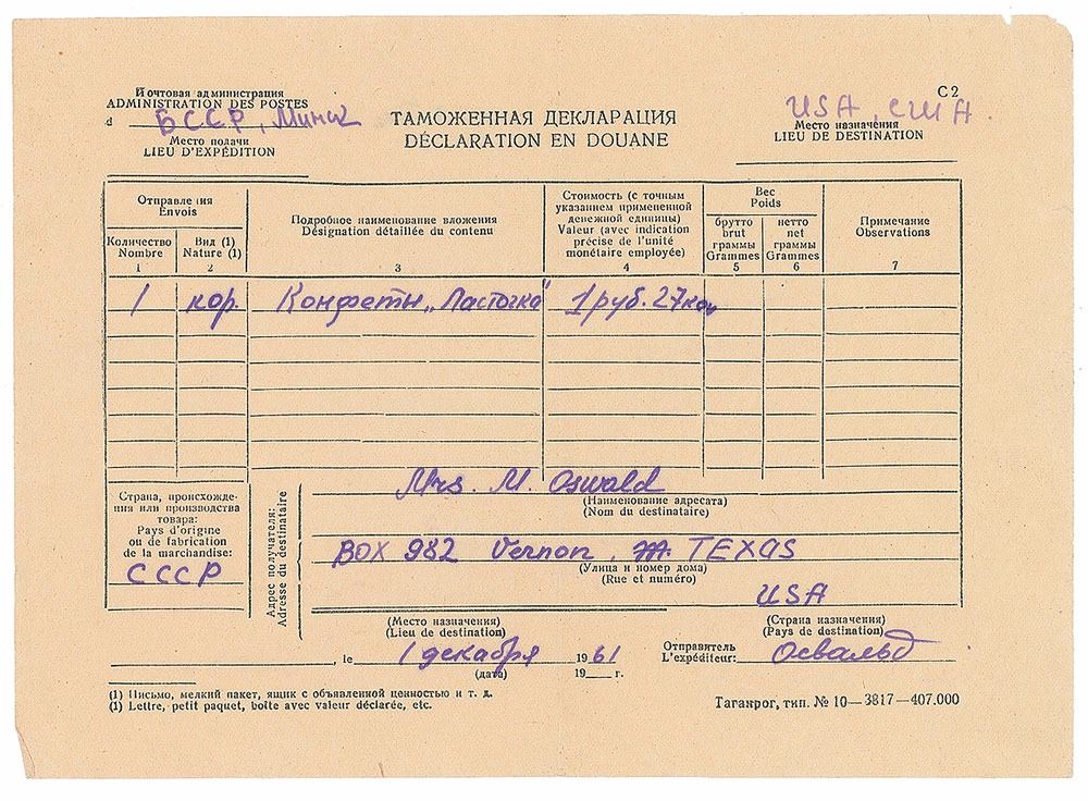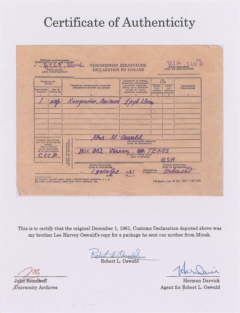 Manuscript partly-printed DS in Russian, one page, 8.25 x 5.75, December 1, 1961. Customs declaration form for a package sent by Lee Harvey Oswald to his mother from Minsk, addressed by his wife Marina to “Mrs. M. Oswald, Box 982, Vernon, Texas.” In fine condition, with a light central vertical fold. Accompanied by a letter of authenticity from his older brother, Robert L. Oswald, stating that this was Lee’s retained copy of the customs form.
