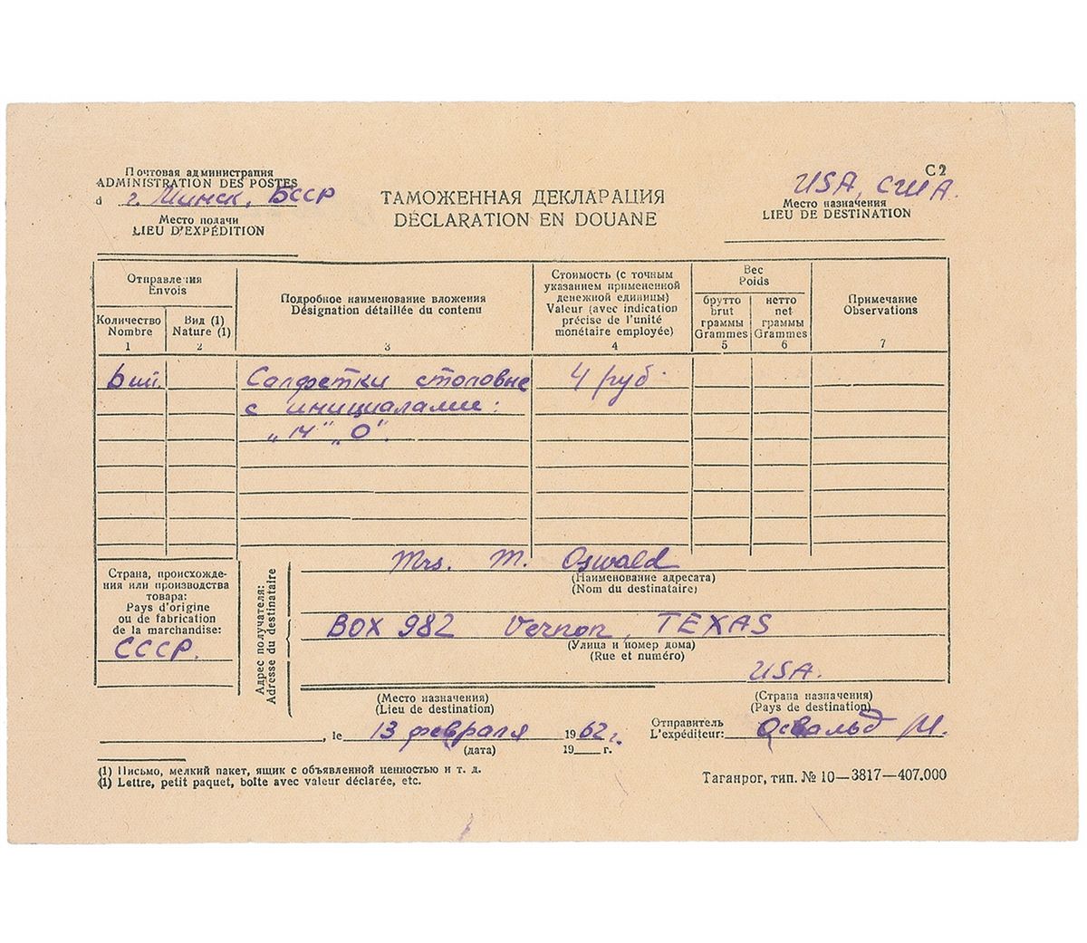 Manuscript partly-printed DS in Russian, one page, 8.25 x 5.75, February 13, 1962. Customs declaration form for a package sent from Lee Harvey Oswald to his mother from Minsk, addressed by Marina to “Mrs. M. Oswald, Box 982, Vernon, Texas.” In fine condition, with a central vertical fold. Accompanied by a letter of authenticity from his older brother, Robert L. Oswald, stating that this was Lee’s retained copy of the customs form.