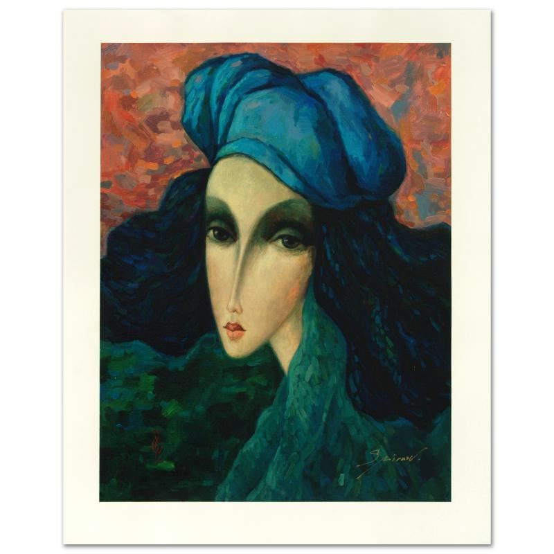 Combining time-honored religious icon painting with western style portraiture, the hauntingly beautiful art of Sergey Smirnov (1953-2006) is inspired by the 'Parsuna' art movement. "Marina" is a limited edition mixed media on canvas, printed in 2006, numbered in verso and hand signed by the artist. Includes Certificate of Authenticity! Measures approx. 13" x 17" (image).