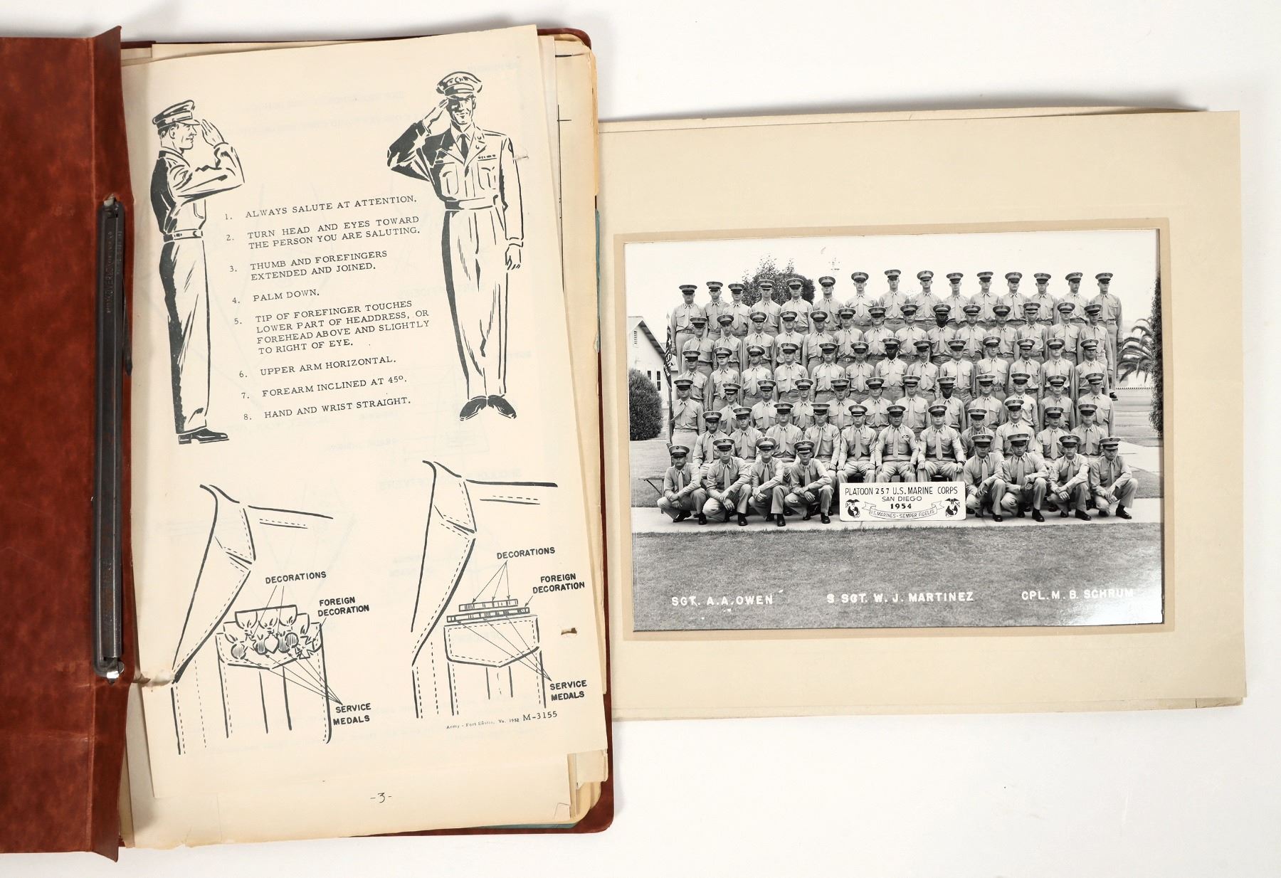 This collection of manuals is from John Thomas of the US Marine Corp dated 1952. The information includes proper uniform dress codes, a driving test, and proper procedures for loading and unloading naval vessels. A personal scrapbook with about 20 pages. A graduating class photo dated 1954 San Diego.