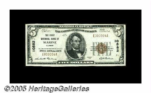<B>Marine, IL</B></I> - $5 1929 Ty. 1 <B>The First NB</B></I> Ch. # 10582<BR>This Madison County bank issued the 1929 series only. The <B>Crisp Uncirculated</B></I> example we offer tonight is from the fourth sheet printed and displays a slightly irregular trim, but is otherwise quite appealing. Our FUN 2003 Signature Sale included an EF $5 Type 1 from this bank. It sold for $345. This should achieve a higher realization.