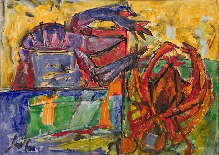 Marcel Janco, Painter. b. 1895, Bucharest, Romania. Immigrated 1941. Studies: 1915 Switzerland, architecture. Teaching: 1953 Kibbutz Seminary, Oranim. Prizes: 1945-46, 1951 Dizengoff Prize; 1958 Histadrut Prize; 1967 Israel Prize for Art. 1982 Worthy of the City of Tel Aviv. 1915 Went to Switzerland and joined Hugo Bell, Jean Arp. 1916 -19 An originator of the Dada movement and participated in all its activities. Painted the famous masks in the style of African masks which were exhibited in the 'Cabaret Voltaire'. Painted abstract reliefs, combining expressionism and cubism. 1921 After a short time in Paris, returned to Bucharest, worked in architecture and was active in the artist's groups. 1948 Was a founder of New Horizons Group. 1952 Participated in the Venice Biennale; 1954 Sao Paulo. 1953 A founder of the Artist's Village, Ein Hod. Died 1984.